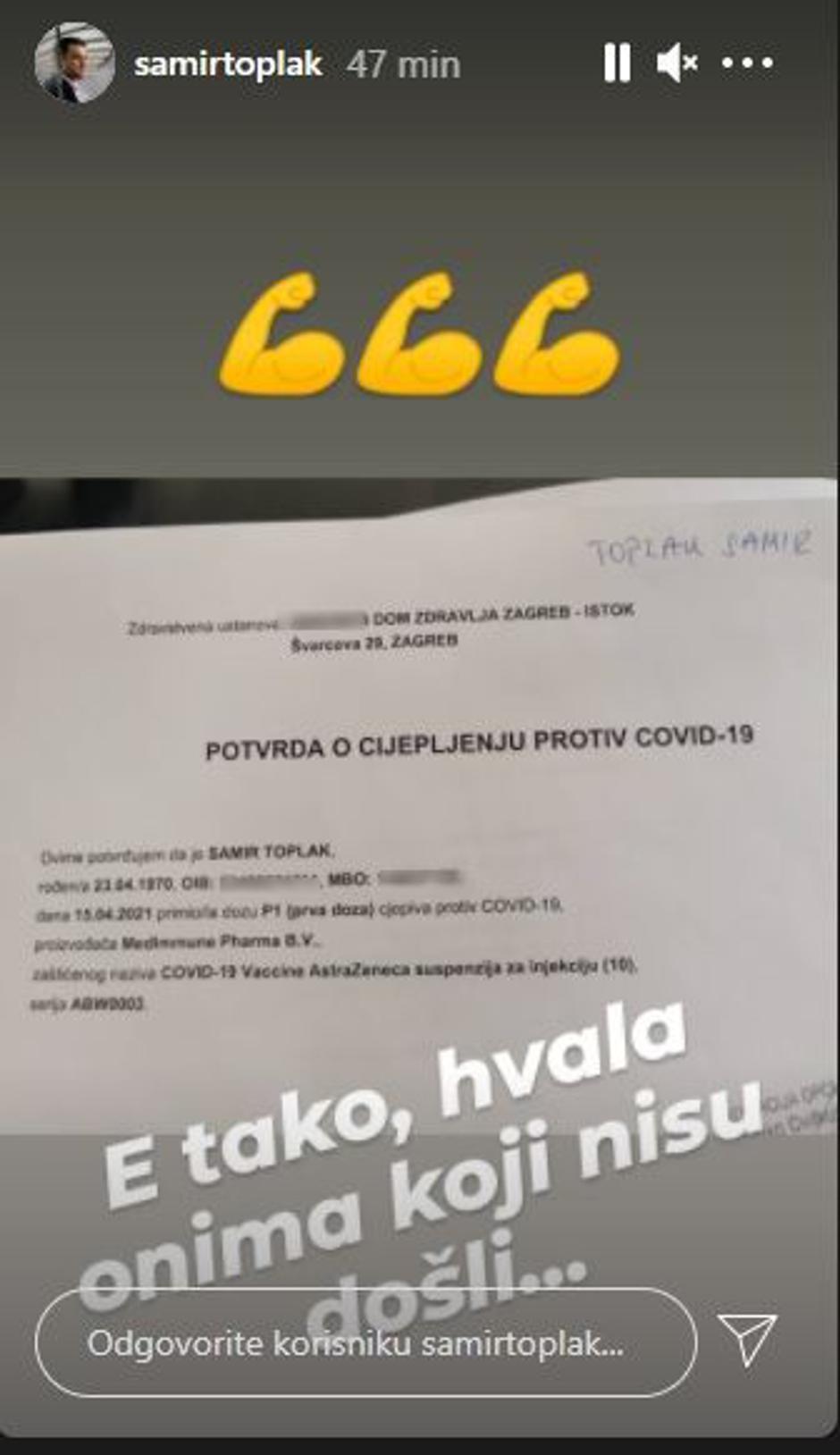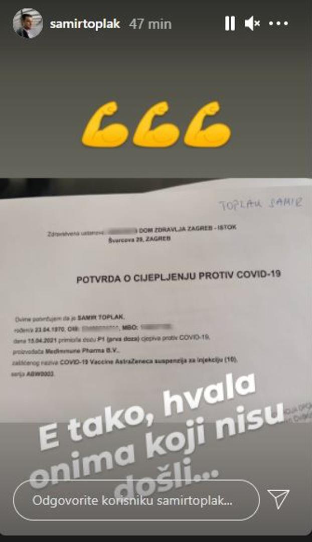 To se dogodilo i hit treneru domaće nogometne lige, Samiru Toplaku. Uvijek za šalu i ovoga je puta trener Lokomotive našao način kako da se zafrkava i u ovoj situaciji. Tako je na storyju koji je podijelio na društvenim mrežama, a na kojemu stoje detalji o primljenom cjepivu napisao: