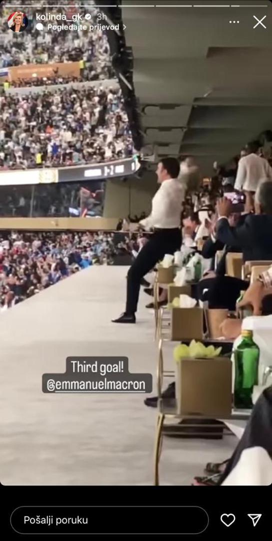 Nakon novog uspjeha vatrenih na glavnom zagrebačkom Trgu spremili su veličanstveni doček, no bivša predsjednica danas nije bila među okupljenim navijačima već je u Kataru pratila finalnu utakmicu između Francuske i Argentine. Utakmicu je gledala iz lože, a usput se malo zabavila pa je snimala urnebesne reakcije francuskog predsjednika Emmanuela Macrona na golove Francuza.