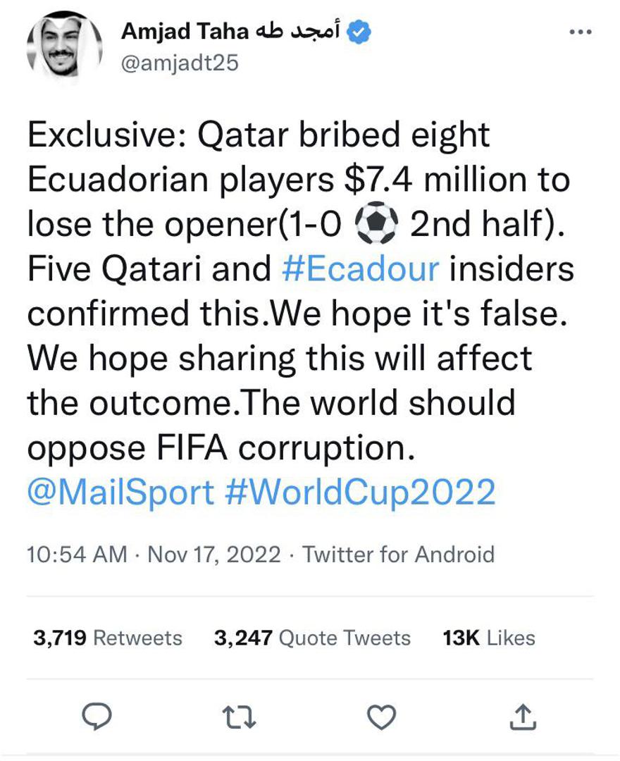 Prema njegovim informacijama, Katar je podmitio osam igrača Ekvadora da dvoboj izgube rezultatom 1:0. Navodno su im ponudili više od sedam milijuna dolara kako bi domaćin pobijedio.