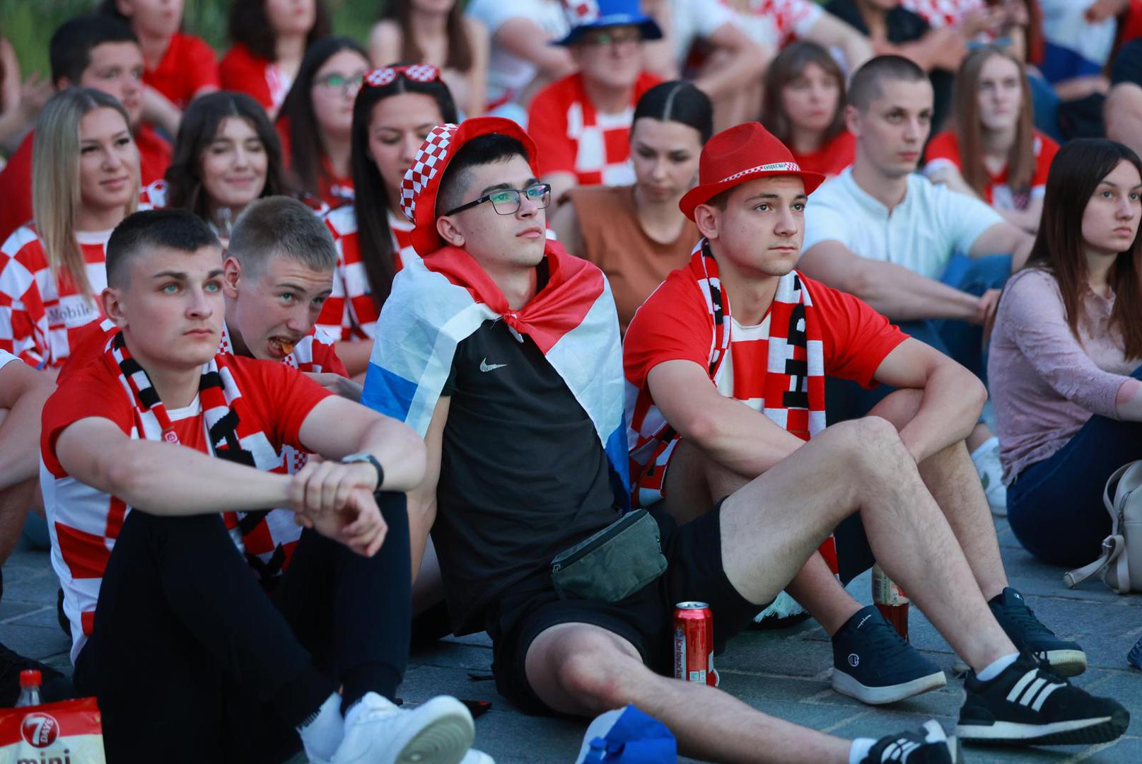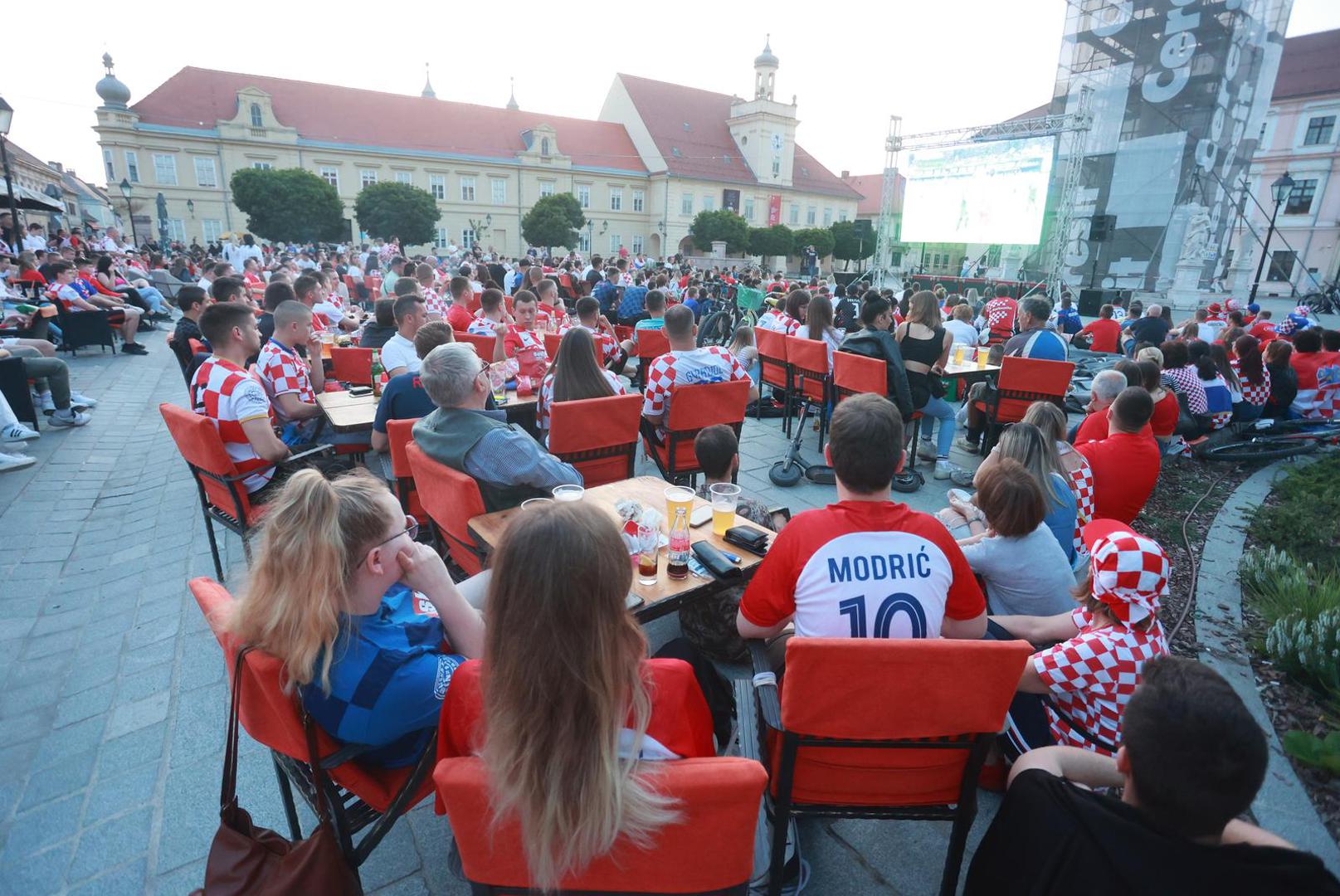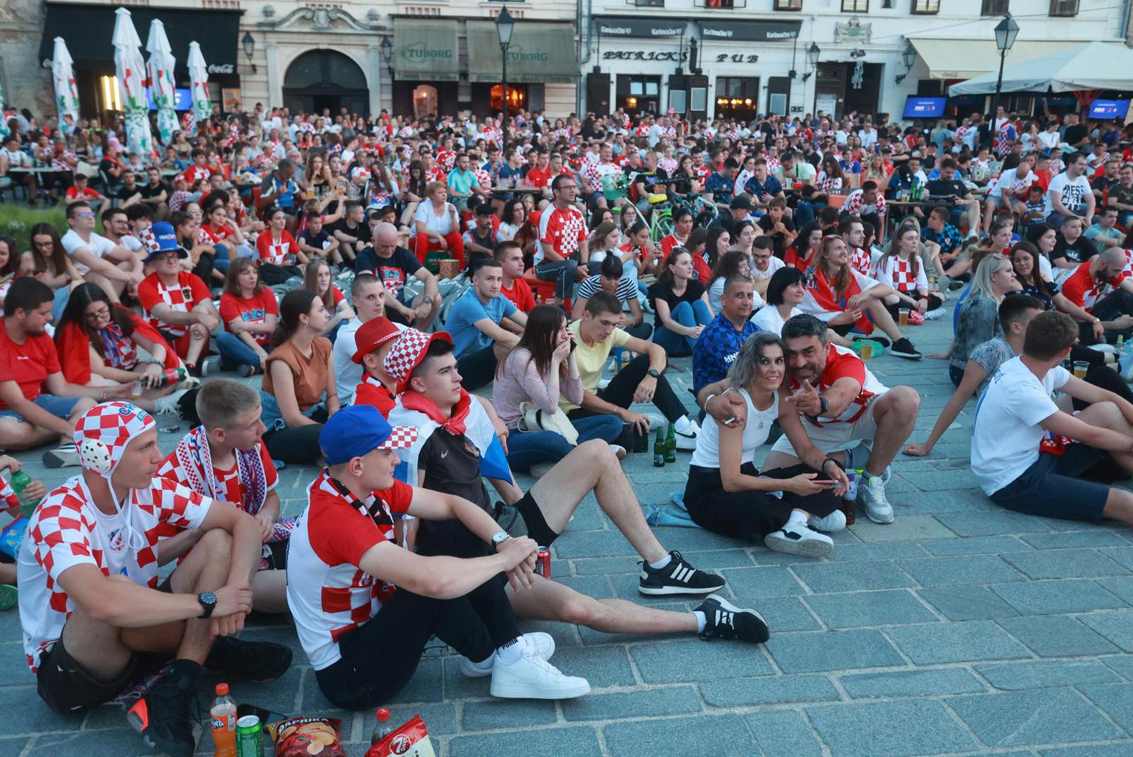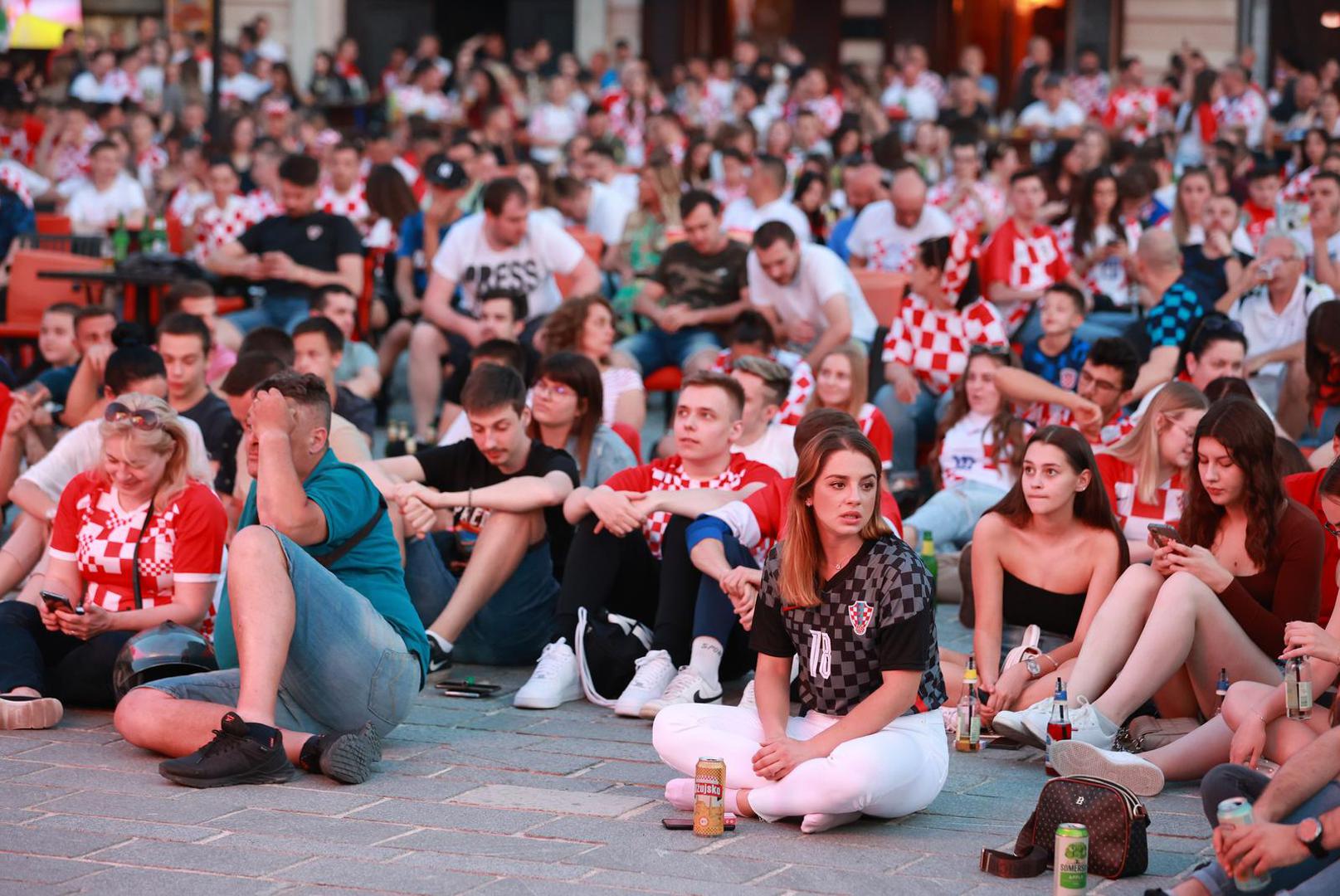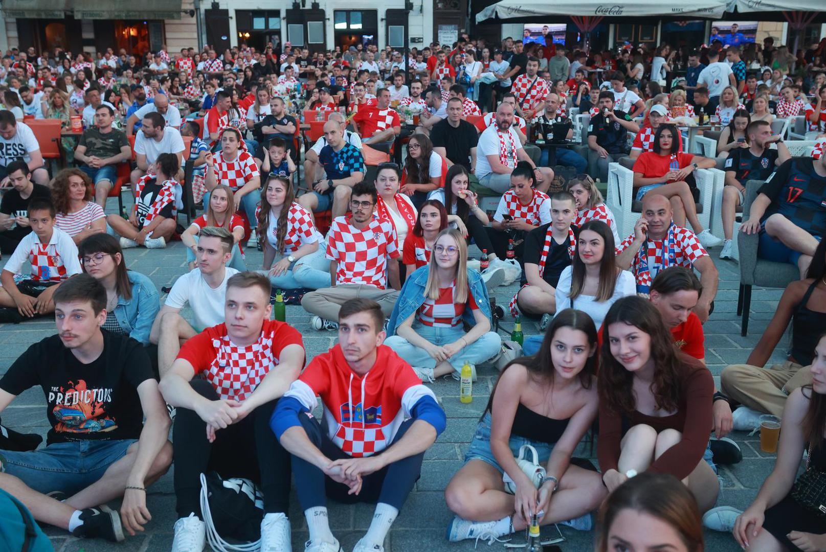 Na trgovima brojnih hrvatskih gradova večeras su se okupili navijači kako bi zajedno uživali u utakmici Hrvatska - Španjolska