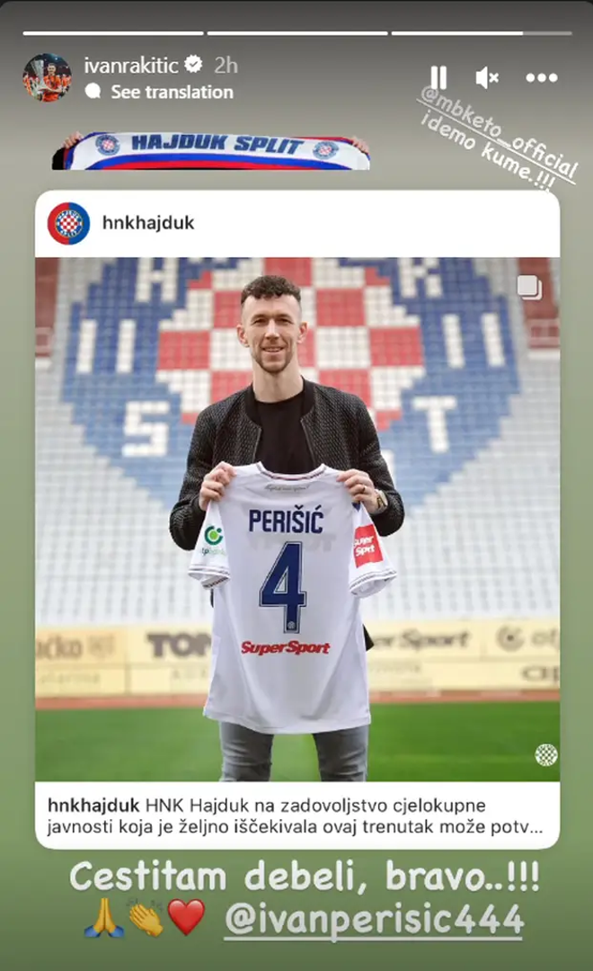 Među među čestitarima javio se legendarni hrvatski reprezentativac Ivan Rakitić koji je na Instagramu stavio objavu posvećenu Perišićevim dolaskom na Poljud.