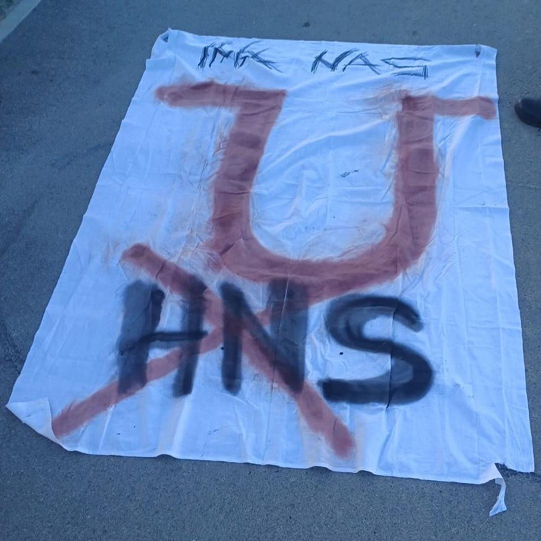 Na transparentu je crvenom bojom bilo napisano veliko ustaško slovo "U", a crnom bojom napisano i prekriženo HNS. Povrh toga stajalo je "ima nas". Sve su zabilježile nadzorne kamere
