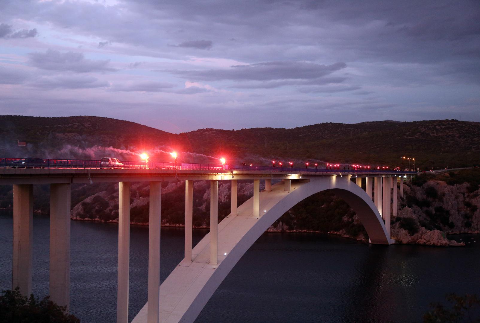 16.09.2022., Sibenik - U 19,13 minuta na sibenskom mostu udruga Ruza hrvatska Zirje i sibenski Funcutu napravili su bakljadu duzinom cijelog mosta u znak sjecanja na "Rujanski rat". Photo: Dusko Jaramaz/PIXSELL