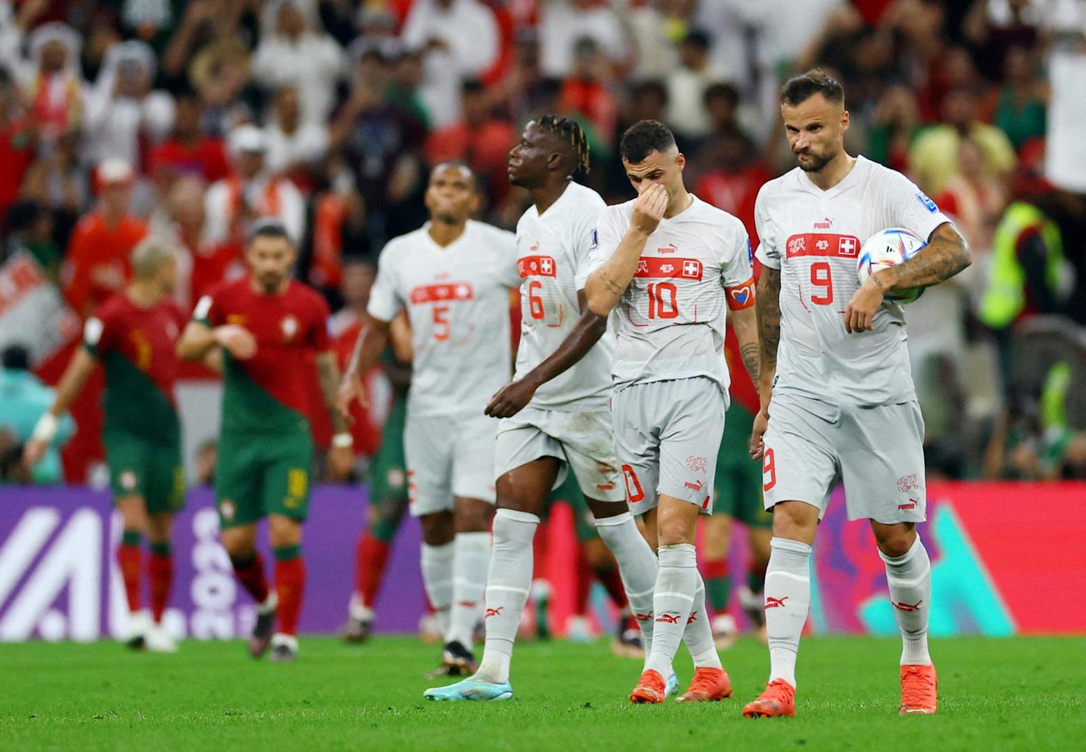 Soccer Football - FIFA World Cup Qatar 2022 - Round of 16 - Portugal v Switzerland - Lusail Stadium, Lusail, Qatar - December 6, 2022 Switzerland's Haris Seferovic, Granit Xhaka and Denis Zakaria look dejected after Portugal's Diogo Costa scores their sixth goal REUTERS/Kai Pfaffenbach REFILE - CORRECTING TEMPLATE Photo: Kai Pfaffenbach/REUTERS