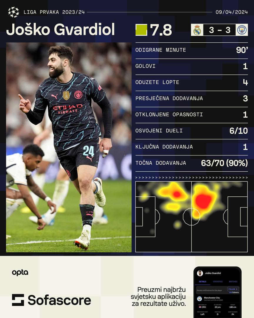 Hrvatski nogometni reprezentativac tako je zabio svoj prvi pogodak za Manchester City od svog dolaska u klub prošloga ljeta za 90 milijuna eura. Vatreni je odigrao izvrsno, a SofaScore mu je dao najvišu ocjenu susreta. Gvardiol je tako potvrdio sjajnu formu u obrambenom i napadačkom dijelu koju je pokazao u domaćim susretima protiv Aston Ville i Arsenala, u kojima je potpuno neutralizirao neke od najboljih napadača engleskih travnjaka. Nakon utakmice dao je izjavu za klupsku televiziju.