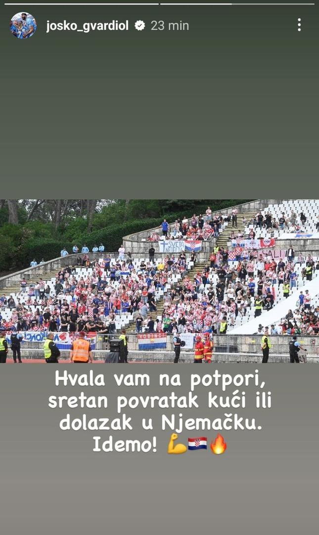 Odmah nakon utakmice objavio je i poruku hrvatskim navijačima pred Euro. Zahvalio se Gvardiol onim navijačima, a bilo ih je oko tisuću, koji su stigli u Lisabon pratiti vatrene na posljednjoj provjeri pred kontinentalnu smotru. Na društvenim je mrežama pokazao koliko ih cijeni uz natpis: