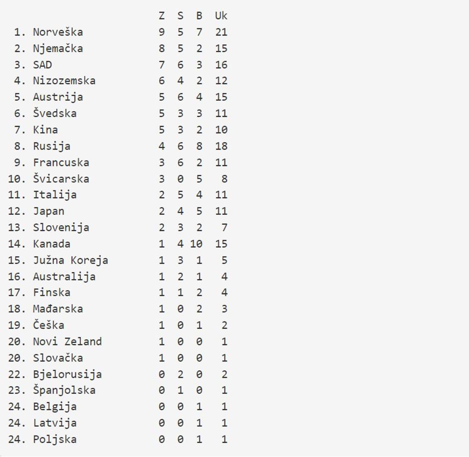 Imaju ih ukupno 21, od čega devet zlata, pet srebra i sedam bronci. Za vrat im pušu Nijemci s ukupno 15 medalja, ali osam zlata i pet srebra. Još uvijek "sramežljivi" Amerikanci su na 16 medalja, od čega sedam zlata i šest srebra.