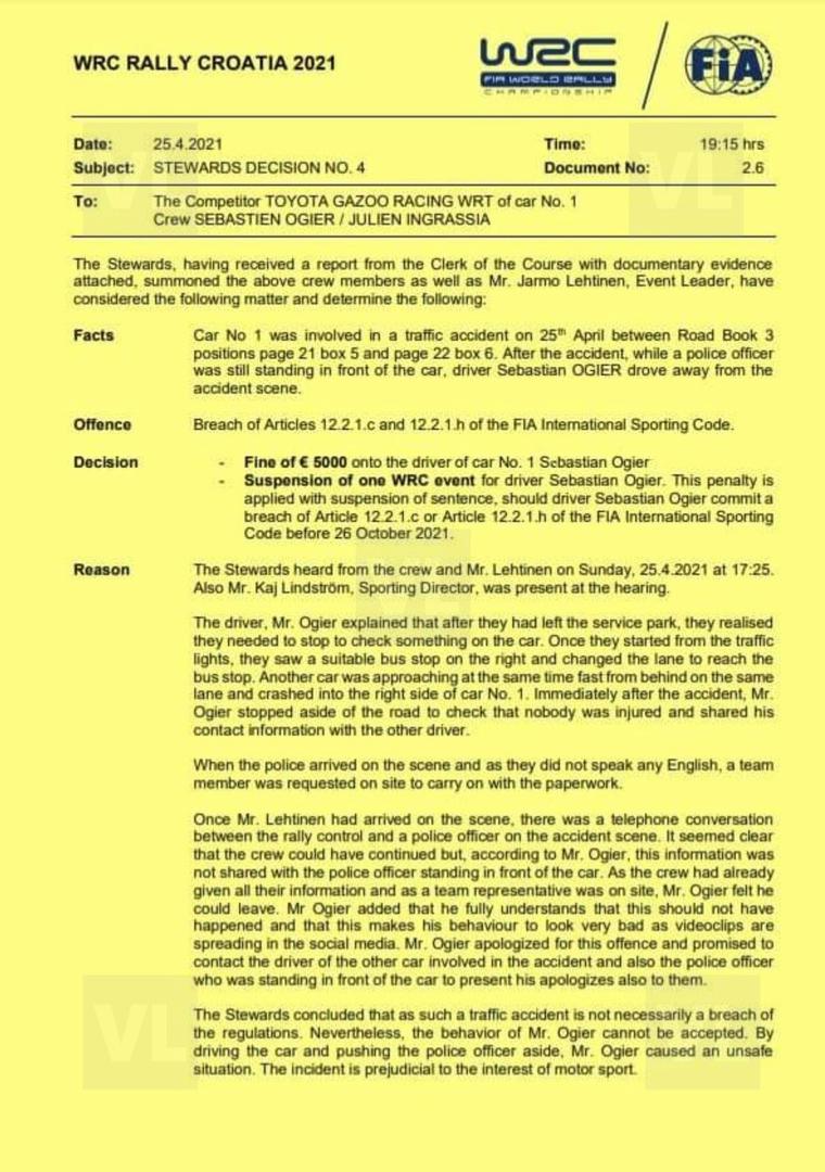 - Zbog prekršaja sportskog kodeksa ponašanja, Sebastien Ogier kažnjen je s 5000 eura i suspenzijom jedne WRC utrke - stoji između ostalog u odluci, a naknadno doznajemo i da je zbog prolaska na crveno kažnjen s još 2000 eura od strane FIA-e te 8000 kuna od strane hrvatske policije.