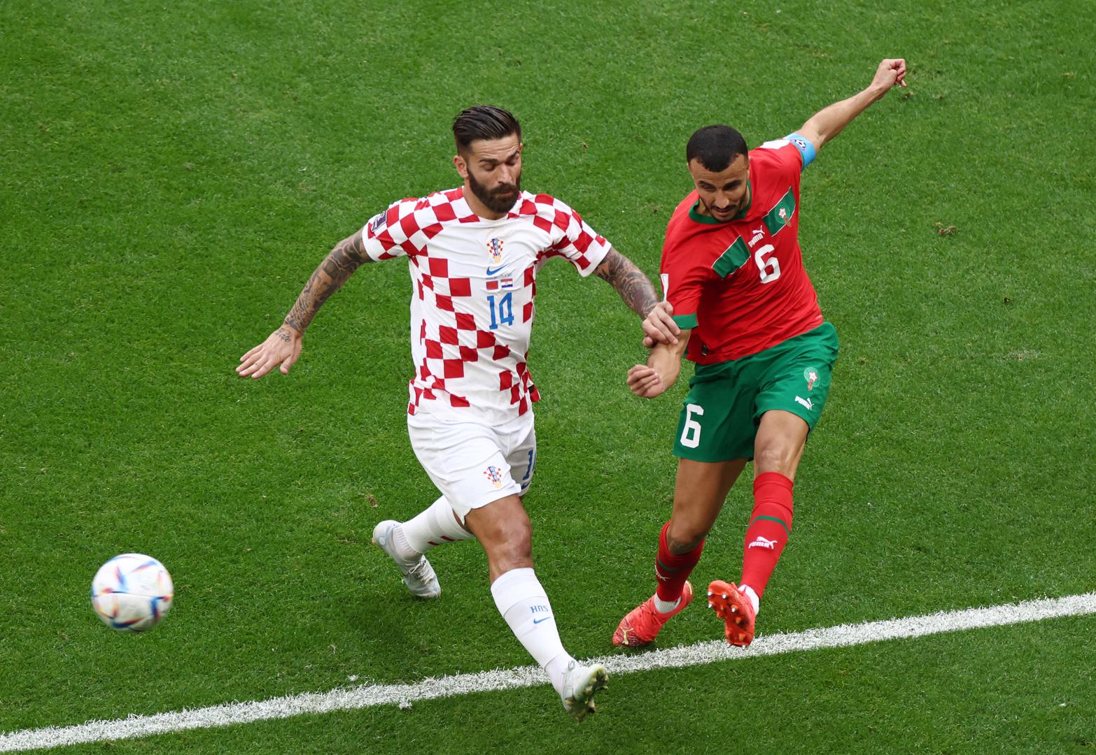 Soccer Football - FIFA World Cup Qatar 2022 - Group F - Morocco v Croatia - Al Bayt Stadium, Al Khor, Qatar - November 23, 2022 Morocco's Romain Saiss in action with Croatia's Marko Livaja REUTERS/Marko Djurica Photo: MARKO DJURICA/REUTERS
