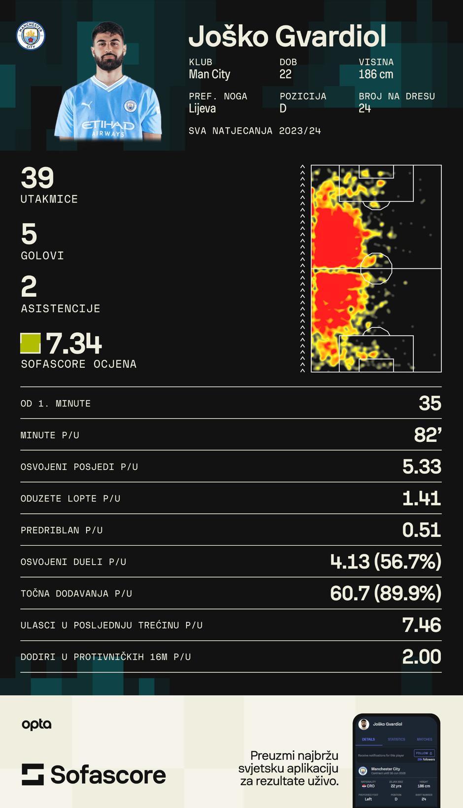 Napomenimo da je Joško Gvardiol, najugodnije Guardiolino otkriće sezone, kod Pepa 29 utakmica odigrao na poziciji lijevog braniča, a deset na svojoj prirodnoj, centralnog braniča. Iz ovih brojki moglo bi se iščitati i koja pozicija Joška čeka u dresu Hrvatske na nadolazećem Europskom prvenstvu.