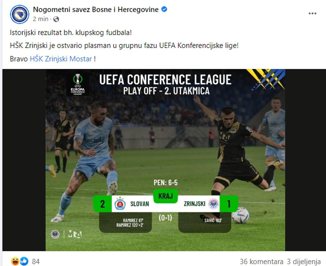 "Povijesni rezultat bh. klupskog nogometa. Zrinjski je ostvario plasman u grupnu fazu Uefa Konferencijske lige. Bravo Zrinjski Mostar", napisali su u savezu da bi kasnije izbrisali objavu i pustili ispravnu.