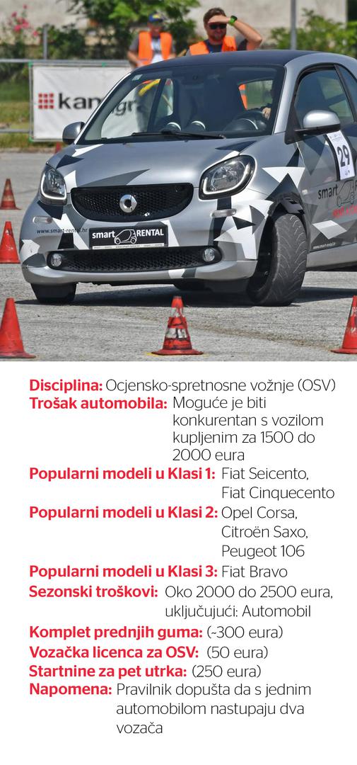 Čitavu sezonu možete odvesti za svega 2000 do 2500 eura. Osim automobila, u to je uključen i komplet prednjih guma za 300 eura, 50 eura za ishodovanje vozačke licence za OSV i 250 eura za startnine na svih pet utrka u sezoni 2025. Pravilnik, također, dopušta da s jednim autom nastupaju dva vozača. U biti, najveća stavka su sami odlasci na utrke, koje se održavaju po cijeloj Hrvatskoj. s obzirom na to da se sve odvija na poligonu, nakon odvoženog ispita spretnosti imate priliku izbliza gledati vrhunske majstore za upravljačem i popraviti svoju tehniku vožnje. Također, za trening je dovoljno svega par čunjeva i zatvoreno ili napušteno parkiralište.