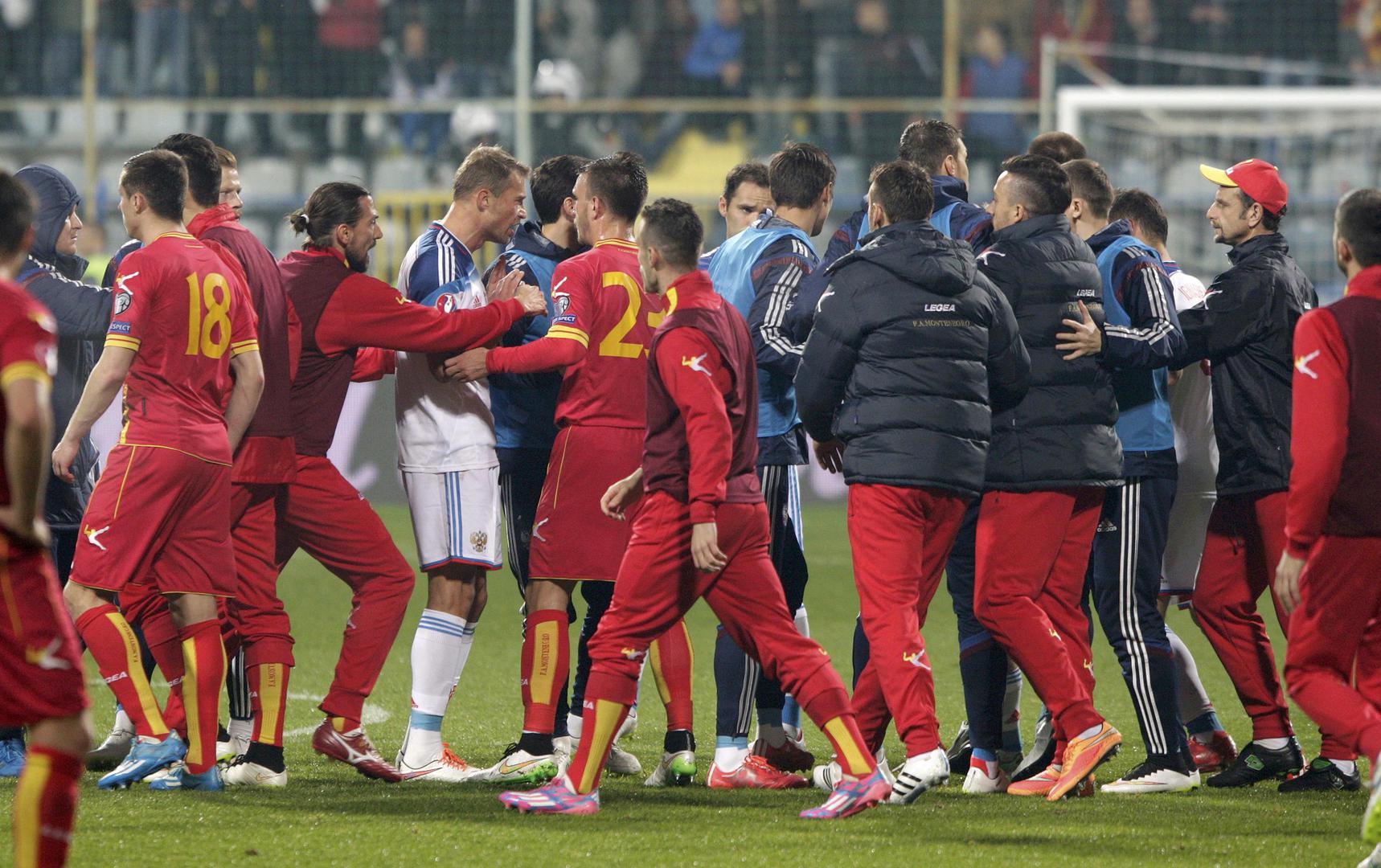 Vratar nogometne reprezentacije Rusije Igor Akinfejev pogođen je bakljom u glavu i utakmica u Podgorici prekinuta je nakon samo desetak sekundi! Vođa navijača sa sjeverne tribine na megafon je otkrio da su identificirali huligana, no nije pomoglo i prekid je trajao 34 minute. Potom je 20 minuta trajala pauza između poluvremena, da bi u 67. minuti bio pogođen Kombarov predmetom s tribine, što je rezultiralo konačnim prekidom.
