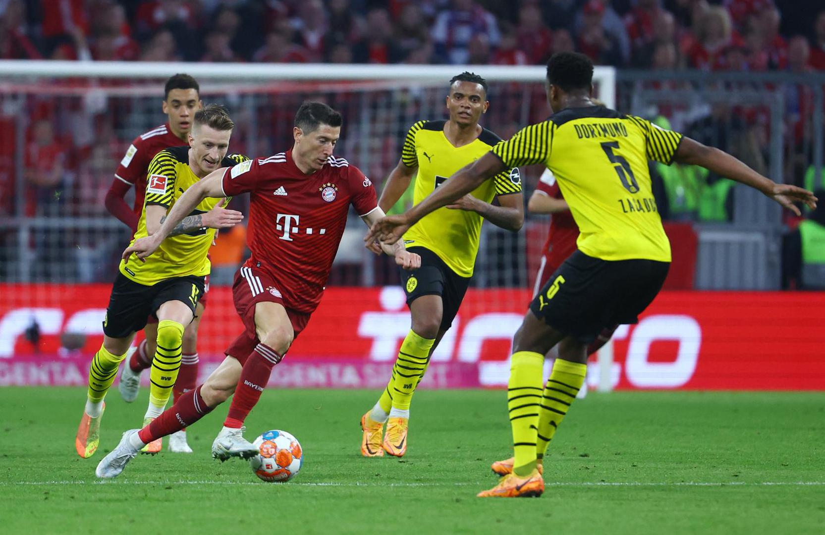 Soccer Football - Bundesliga - Bayern Munich v Borussia Dortmund - Allianz Arena, Munich, Germany - April 23, 2022 Bayern Munich's Robert Lewandowski in action with Borussia Dortmund's Marco Reus and Dan Axel Zagadou REUTERS/Kai Pfaffenbach DFL REGULATIONS PROHIBIT ANY USE OF PHOTOGRAPHS AS IMAGE SEQUENCES AND/OR QUASI-VIDEO. Photo: Kai Pfaffenbach/REUTERS