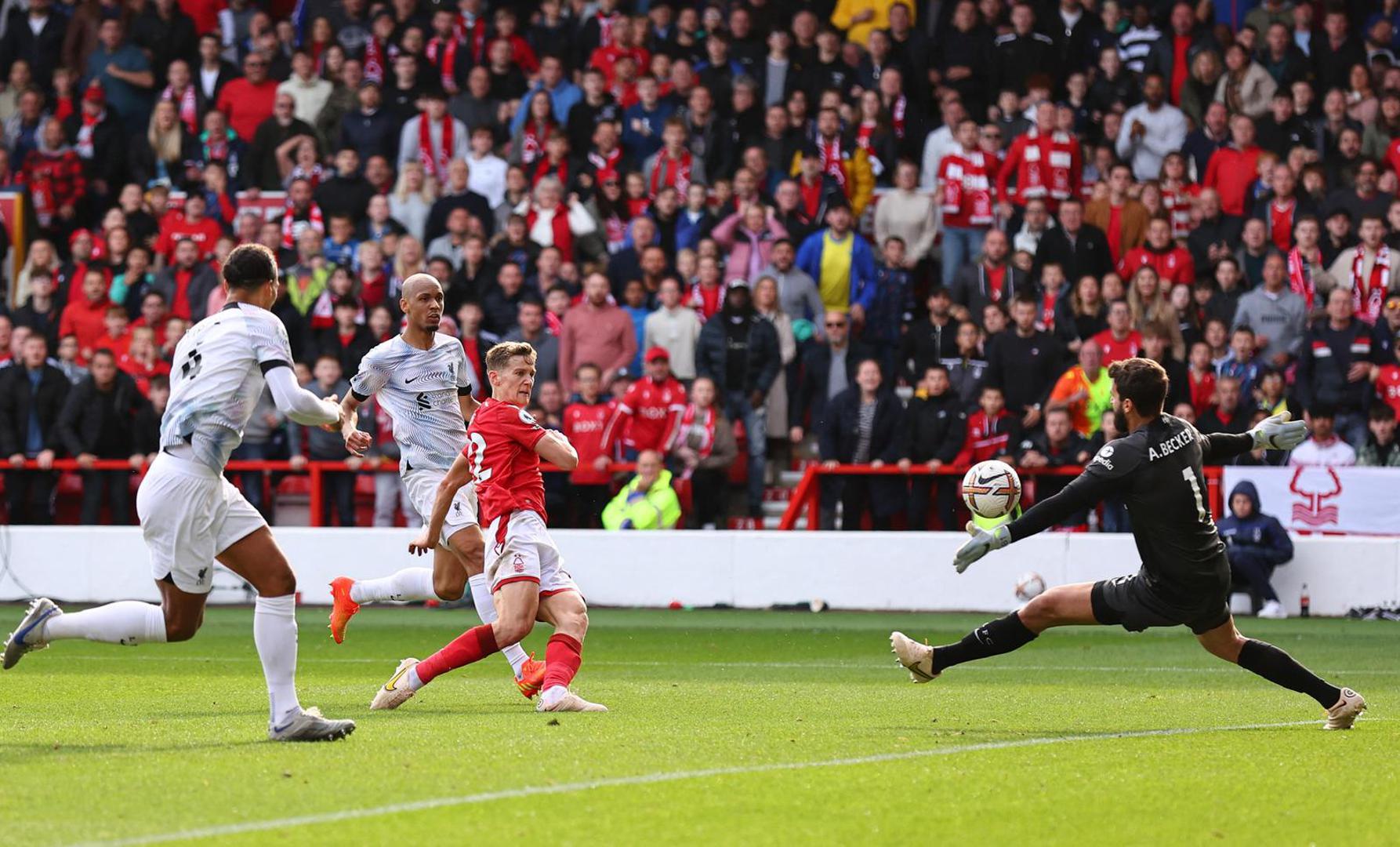Soccer Football - Premier League - Nottingham Forest v Liverpool - The City Ground, Nottingham, Britain - October 22, 2022 Liverpool's Alisson saves a shot from Nottingham Forest's Ryan Yates REUTERS/David Klein EDITORIAL USE ONLY. No use with unauthorized audio, video, data, fixture lists, club/league logos or 'live' services. Online in-match use limited to 75 images, no video emulation. No use in betting, games or single club /league/player publications. Please contact your account representative for further details. Photo: David Klein/REUTERS