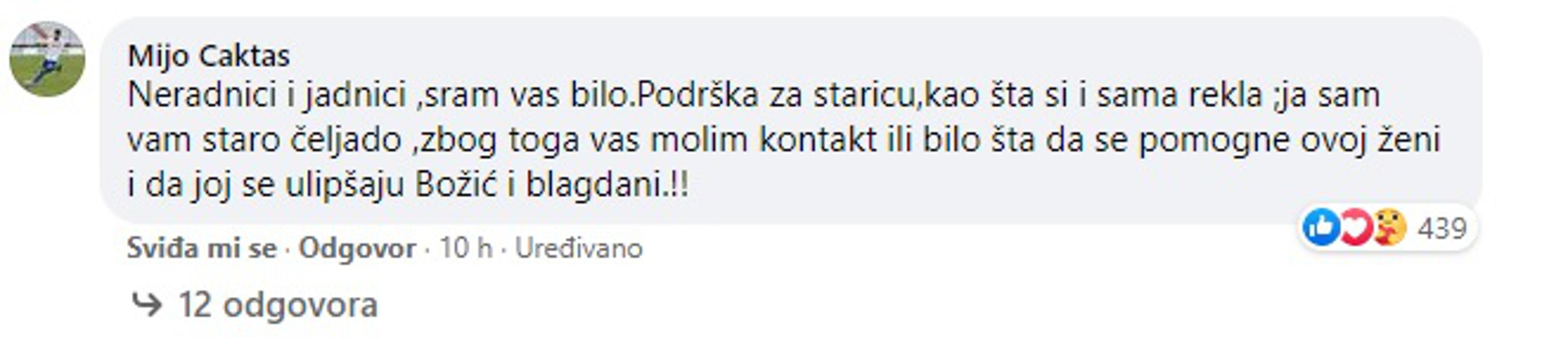 - Neradnici i jadnici, sram vas bilo! Podrška za staricu. Molim vas kontakt da se pomogne ovoj ženi i da joj se uljepšaju Božić i blagdani - napisao je ogorčeni Caktaš u komentarima na Facebooku ispod članka objavljenog na Dalmatinskom portalu.