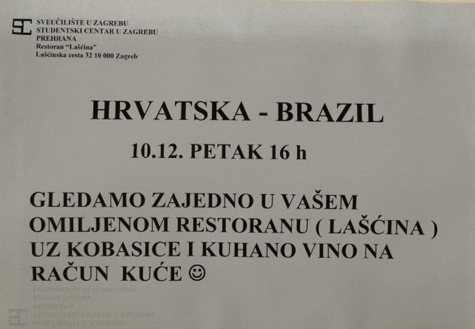 Naime, u prostorijama menze tog doma, koji se nalazi u istoimenoj četvrti, između poznatijih četvrti Kvatrić i Maksimir, organizirano je zajedničko gledanje utakmice četvrtfinala Svjetskog prvenstva u Kataru između Hrvatske i Brazila, u petak s početkom u 16 sati po našem vremenu.