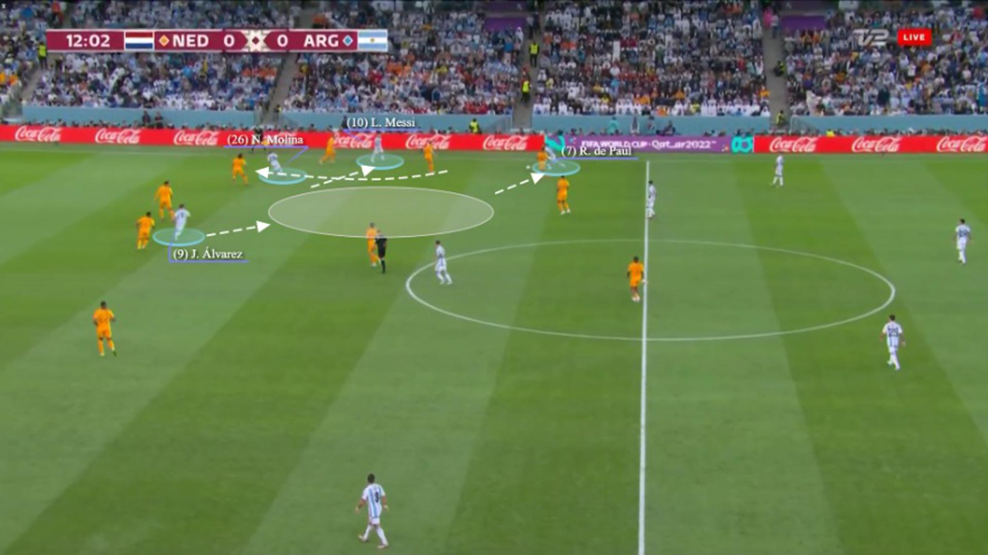Prema analizi Total Football Analyticsa, najvažnija stvar koju Argentina radi u posjedu je da odvlačenjem igrača otvara male rupe na 25 do 40 metara od suparničkog gola u poludesnoj zoni, takozvanom desnom "halfspaceu". Te prazne rupe možete vidjeti u svim utakmicama ovog Svjetskog prvenstva, a njihova je poanta otvaranje prostora za klasični ulazak Lionela Messija s duplim pasovima ili driblinzima s desne strane u sredinu terena, gdje je šutom s 18-20 metara vjerojatno u tom naletu i danas najopasniji igrač u svjetskom nogometu.