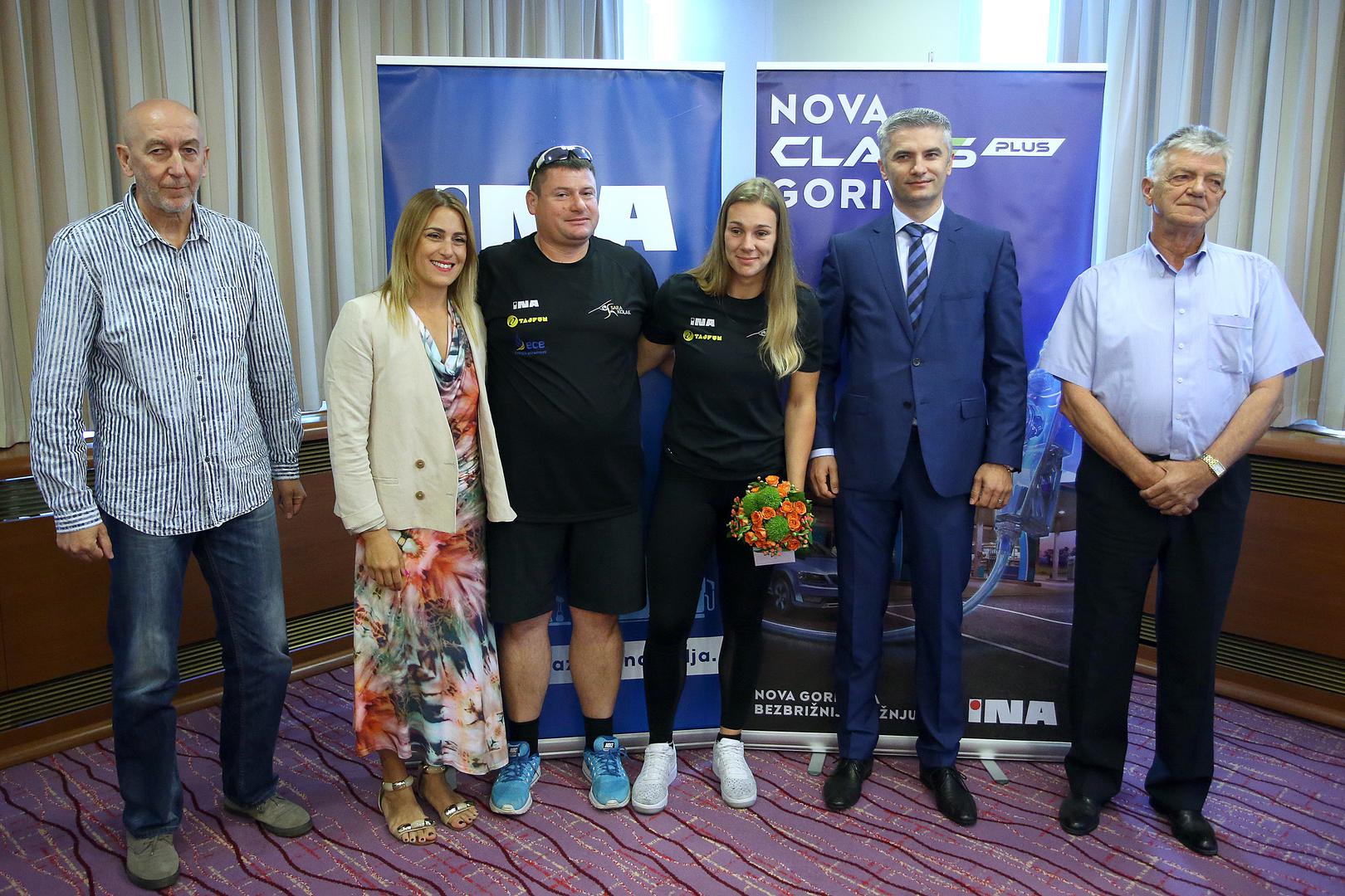 17.07.2017., Zagreb - Sara Kolak i INA potpisali su sponzorski ugovor i odrzali konferenciju za medije u Hotelu Panorama. Mladen Katalinic, Andrej Hajnsek, Sara Kolak, Darko Markotic, Luciano Susanj. "nPhoto: Goran Stanzl/PIXSELL