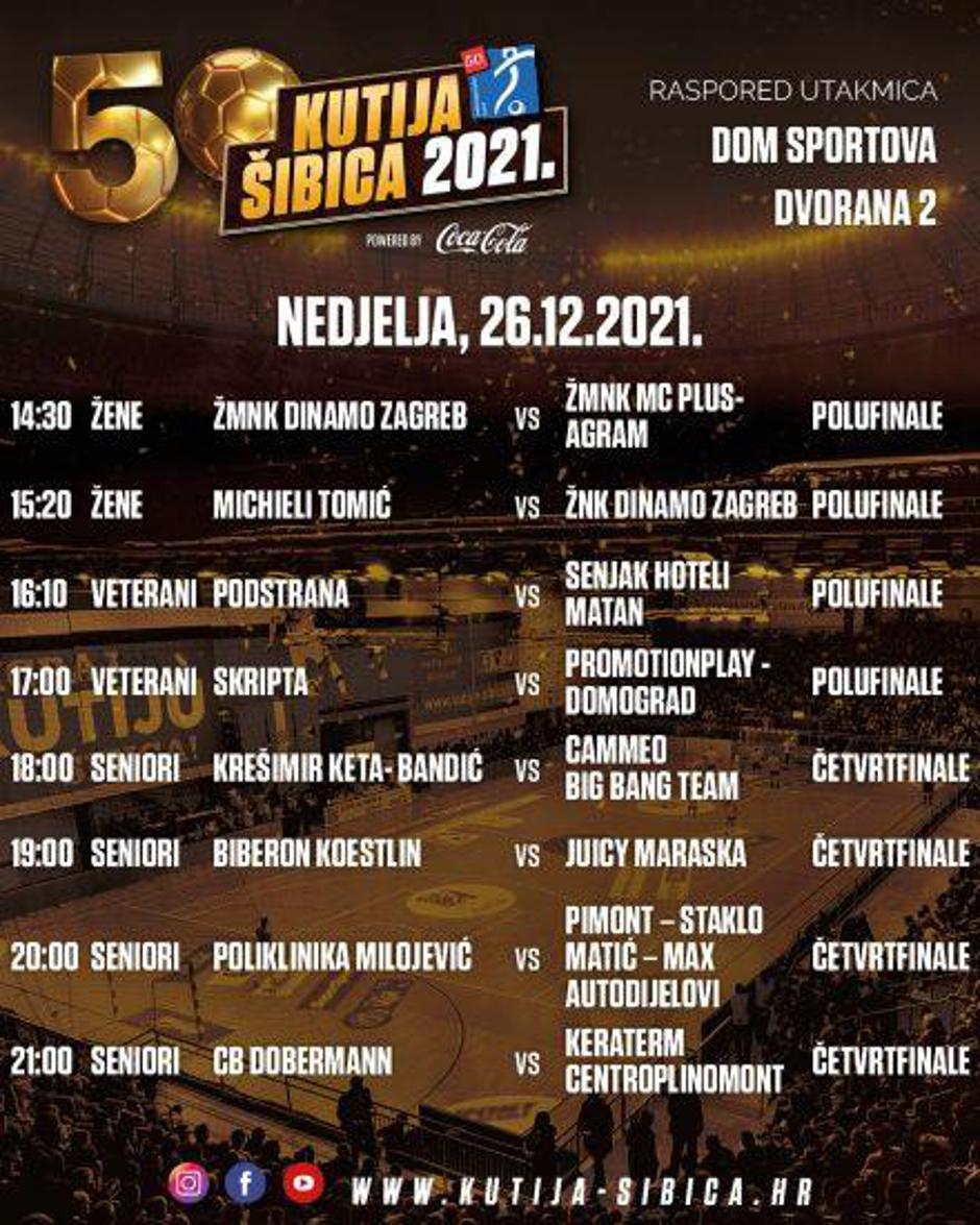 Najbolje četiri momčadi 14. veteranskog turnira Kutija šibica odmjerit će svoje snage 26. prosinca – u 16.10 sati nas očekuje utakmica između Senjak Hoteli Matan i Podstrane dok će dvoboj drugog polufinalnog para započeti u 17 sati, i to između momčadi Skripte i Promotionplaya. Utakmica za treće mjesto igra se 28. prosinca u 16 sati, a tko će se okruniti titulom pobjednika četrnaeste po redu Kutije za veterane, doznat će se 29. prosinca u 18.30 sati.