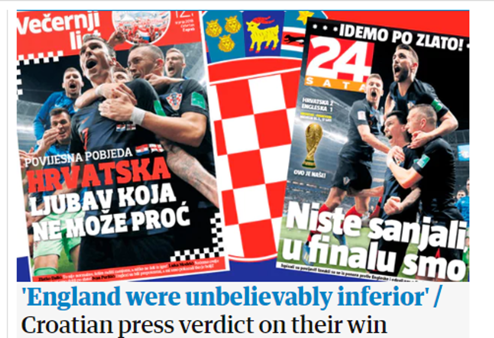 - Večernji list je objavio tekst s naslovom 'Srušili smo Englesku, Hrvatska je u finalu Svjetskog prvenstva' u kojem Željko Janković piše kako će Hrvatska i Francuska odlučiti 'tko u ovom trenutku igra najbolji nogomet na planeti'. Ispada da je to retoričko pitanje jer je sam odgovorio na njega dodajući: 'Ma, to je Hrvatska, nemojte ni sumnjati u to!'.