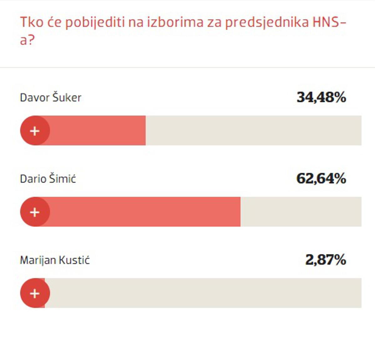 U ovoj zadnjoj pitali smo "Tko će pobijediti na izborima za predsjednika HNS-a?" Dario Šimić dobio je 62,64 posto glasova, a Davor Šuker 34,48. Marijan Kustić, koji je neko vrijeme kotirao kao izgledni kandidat, a sada bi se mogao i povući iz utrke, dobio je samo 2,87 posto.