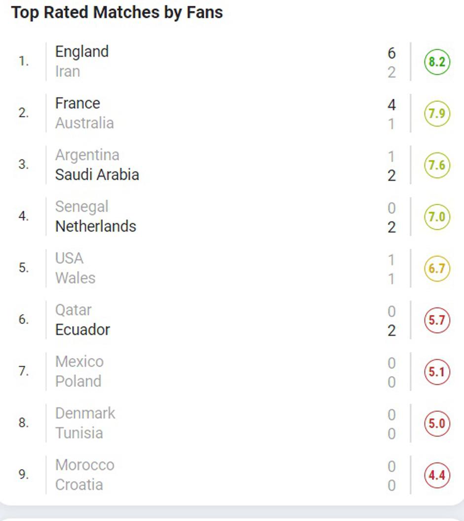 Trenutno najbolje ocijenjena utakmica je, očekivano, utakmica s najviše pogodaka, susret Engleske i Irana u kojem je momčad Garetha Southgatea slavila rezultatom 6:2. Ocijenjena je s visokom 8.2 ocjenom.