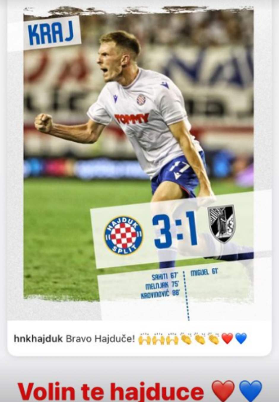Pobjedu Hajduka popratio je i njegov bivši igrač Tonio Teklić uz natpis: "Volim te, Hajduče."