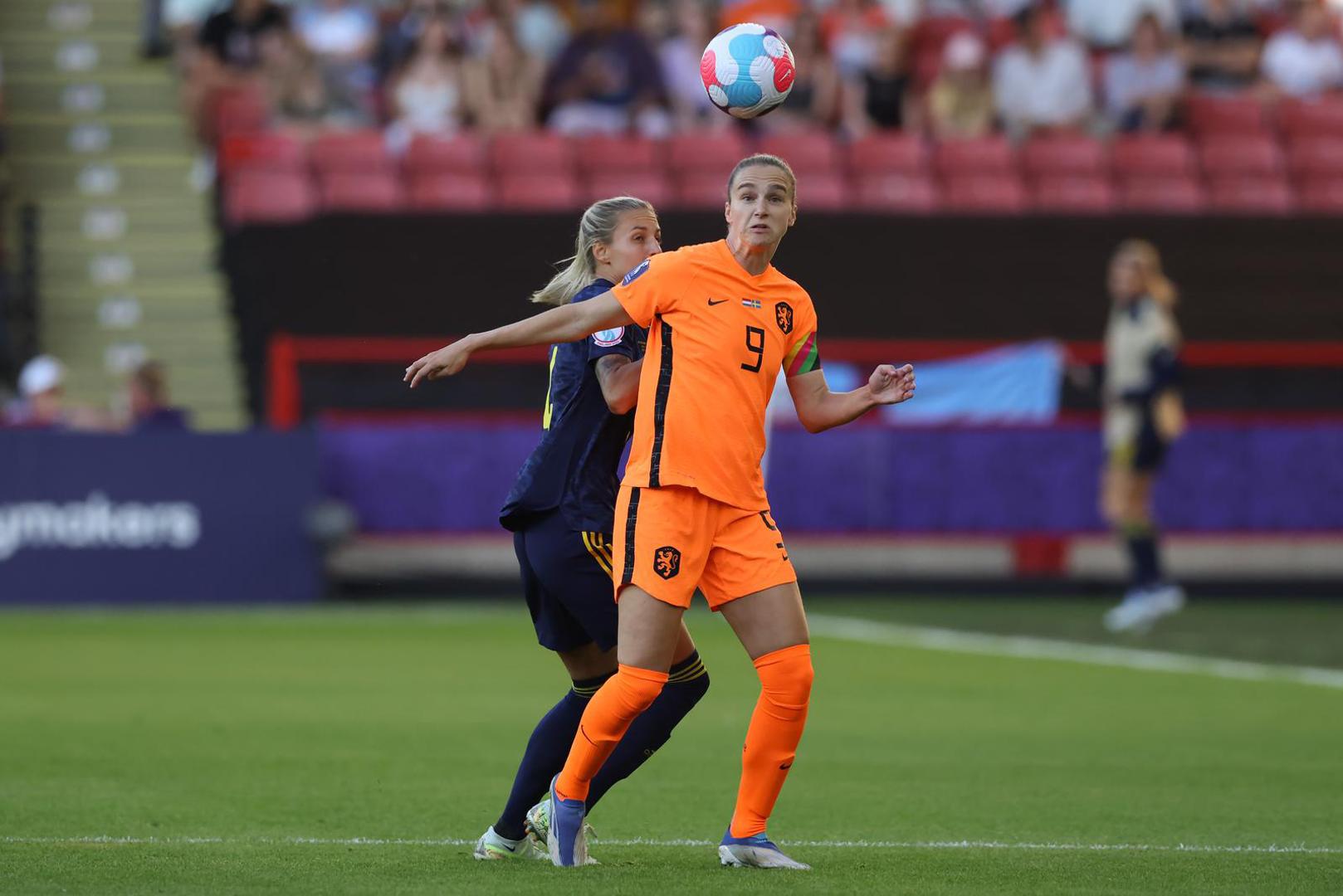 July 9, 2022, Sheffield, United Kingdom: Sheffield, England, 9th July 2022. Vivianne Miedema of Netherlands focuses on the ball under pressure from Nathalie Bjorn of Sweden during the UEFA Women's European Championship 2022 match at Bramall Lane, Sheffield. Photo via Newscom Photo: Jonathan Moscrop/NEWSCOM