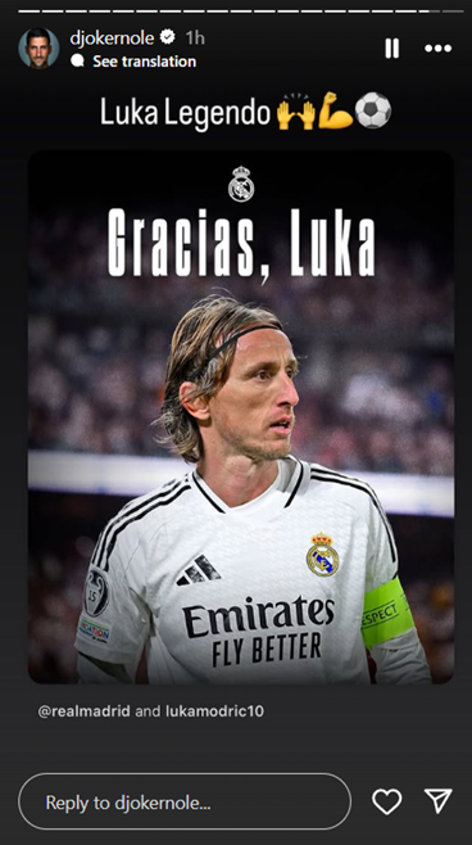 Vijest o Modrićevom emotivnom rastanku s Bernabeuom brzo je obišla svijet, a među onima koji su osjetili potrebu javno mu odati priznanje našao se i jedan od najvećih tenisača svih vremena, Novak Đoković. Srpski as, poznat po tome što redovito prati i podržava uspjehe sportaša iz regije, na svom je Instagram profilu objavio "story" posvećen upravo Modriću. Uz niz emotikona koji simboliziraju poštovanje i divljenje, Đoković je napisao samo dvije, ali iznimno snažne riječi: "Luka legendo!". Ova kratka, ali srčana poruka jasno je pokazala koliko Đoković cijeni Modrićevu karijeru, njegove uspjehe, profesionalizam, upornost i sportski duh, kvalitete koje je i sam tenisač u više navrata isticao govoreći o hrvatskom nogometašu.