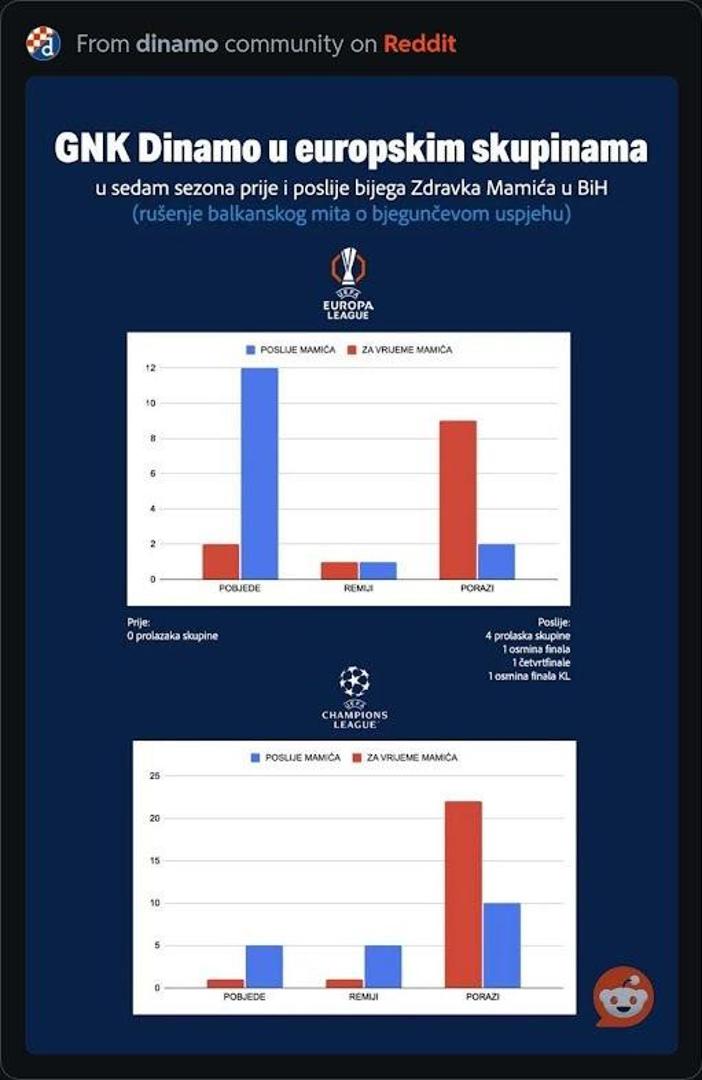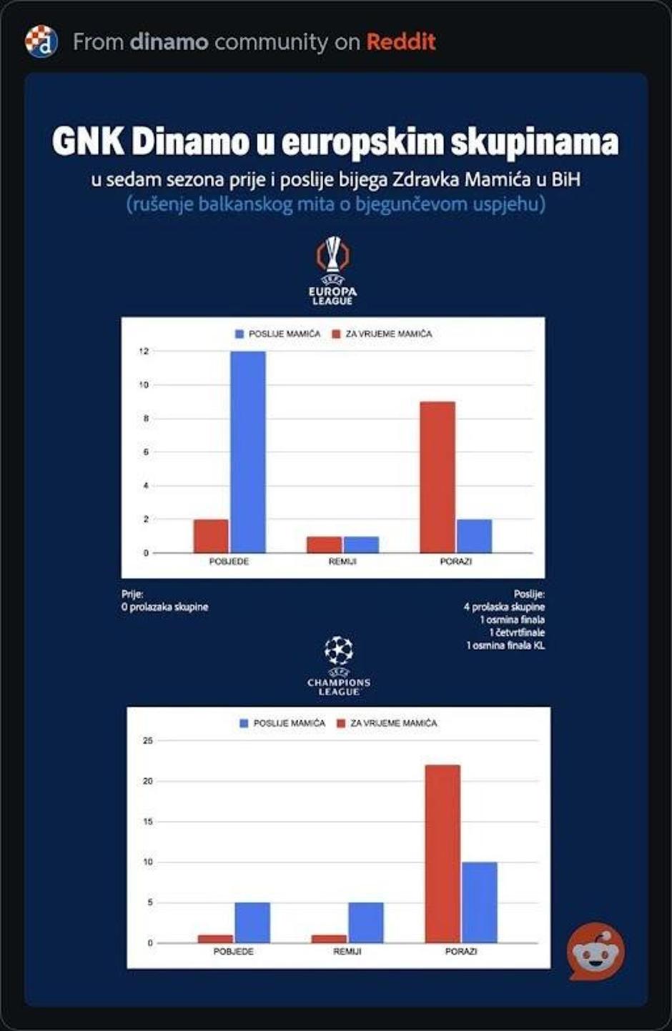 Dio navijača posebno je istaknuo širi kontekst ove zanimljive priče. Dinamova zajednica na platformi Reddit usporedila je europske učinke kluba u sedam sezona prije i poslije bijega Zdravka Mamića u BiH te poručila da je 'srušen balkanski mit o uspjehu bjegunca Zdravka Mamića'.