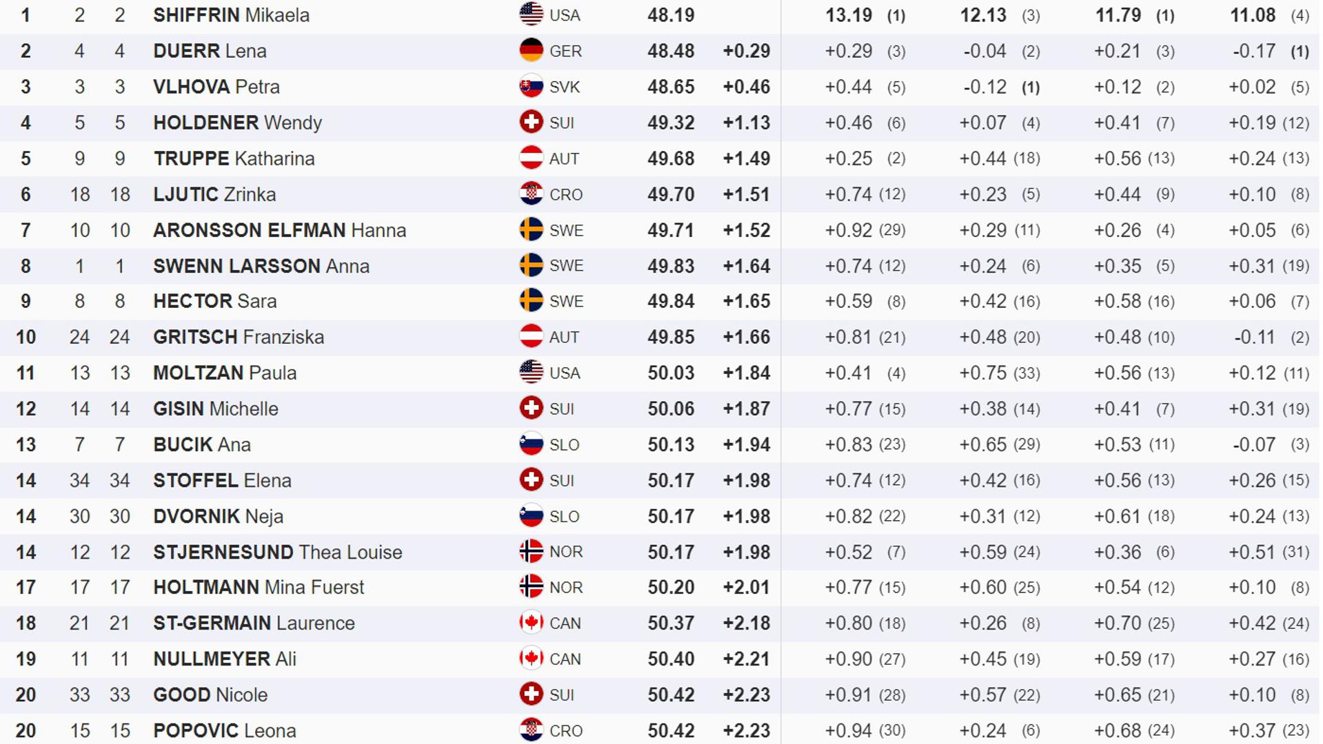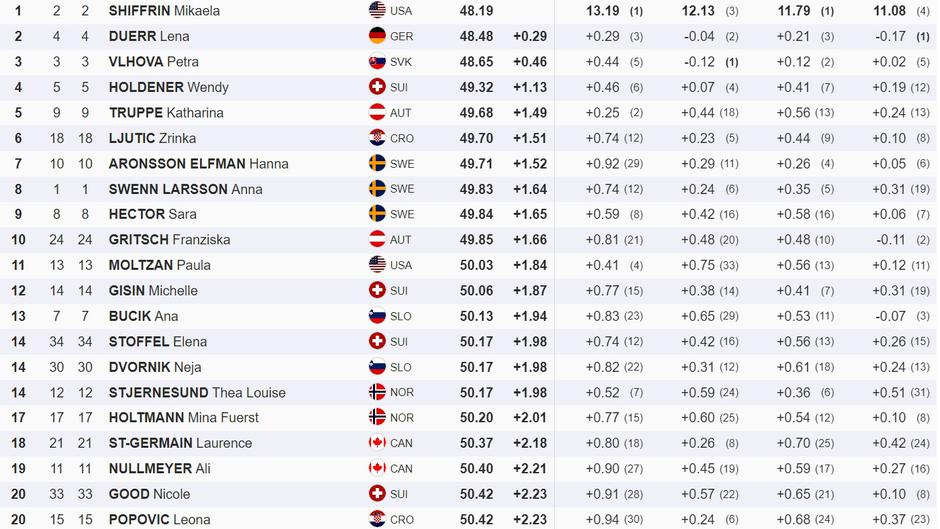 Shiffrin je 'svijet za sebe' u slalomu ove sezone (četiri pobjede i dva druga mjesta u sedam slaloma). Iza nje su nakon prve vožnje na mjestima za postolja njemačka skijašica Lena Duerr (+0.29) te Slovakinja Petra Vlhova (+0.46).