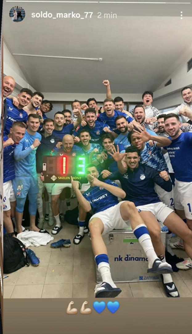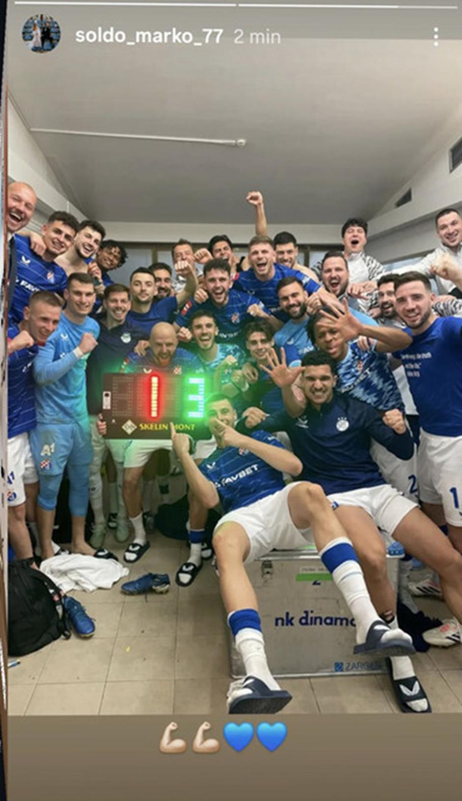 Nogometaš Dinama Marko Soldo objavio je fotografiju slavlja iz poljudske svlačionice. Igrači Dinama pozirali su sa semaforom za izmjene igrača, na kojem je stajao rezultat 1:3.