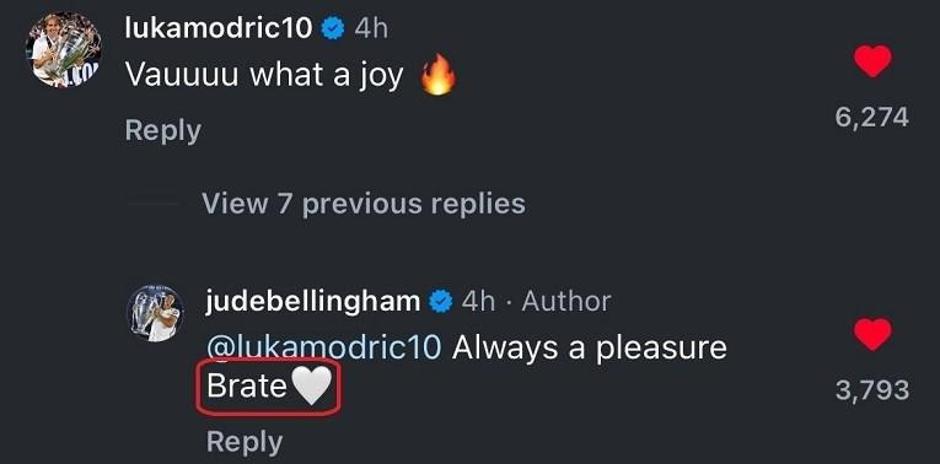 Nakon utakmice na Instagramu se javila zvijezda Reala, Jude Bellingham. Engleski reprezentativac na svojoj je društvenoj mreži objavio fotografiju s Modrićem, a Luka mu je ispod ostavio komentar na engleskom: "Vauuu, kakav užitak". Bellingham mu je pak odgovorio sa: "Luka Modrić, uvijek mi je čast" uz dodatak "brate" na hrvatskom jeziku.