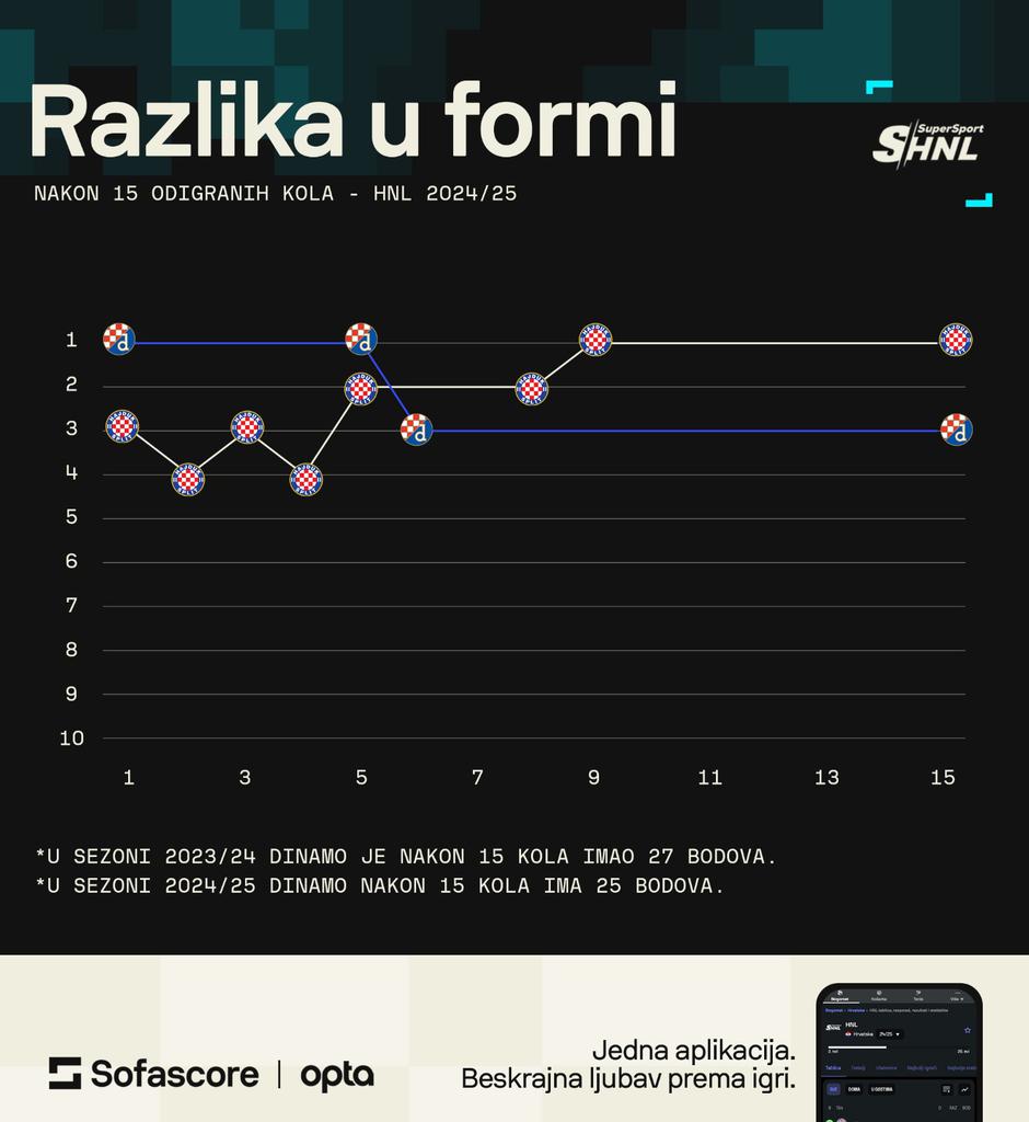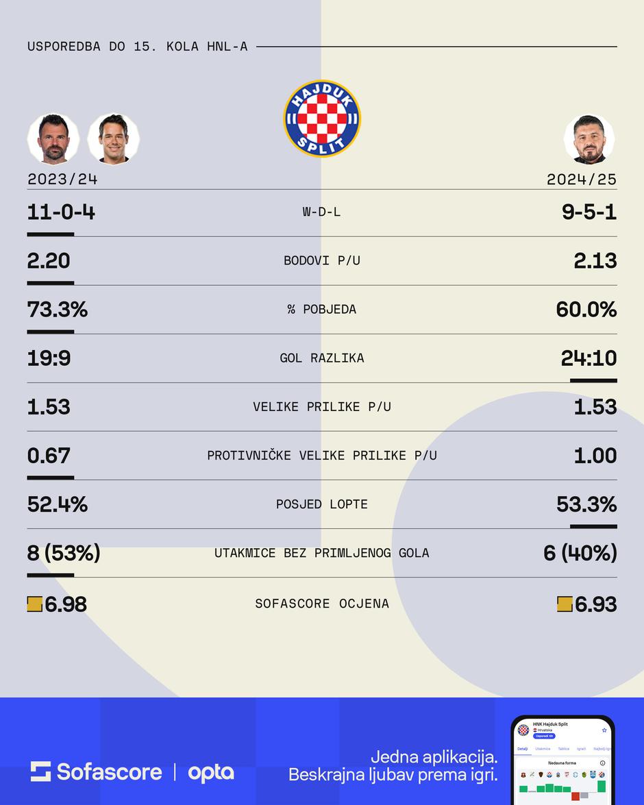 Statistika kaže da je prošlosezonski Hajduk, kojeg su vodili Ivan Leko i Mislav Karoglan, u prvih 15 kola imao uspješnije brojke nego Gattusov Hajduk. Upisali su dvije pobjede više (ali imaju i tri poraza više), dok Gattuso ima i pet remija, a Leko i Karoglan nisu kombinirano ostvarili nijedan.