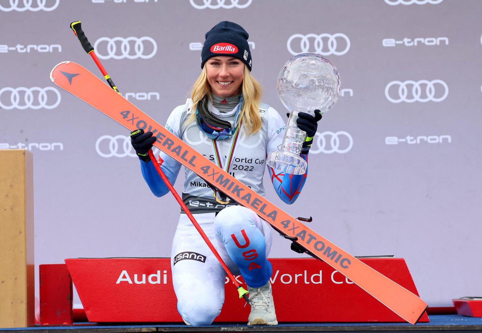 FILE PHOTO: Alpine Skiing - FIS Alpine Ski World Cup - Meribel, France - March 20, 2022 Mikaela Shiffrin of the U.S. celebrates on the podium after winning the overall Globe trophy REUTERS/Denis Balibouse/File Photo Photo: DENIS BALIBOUSE/REUTERS