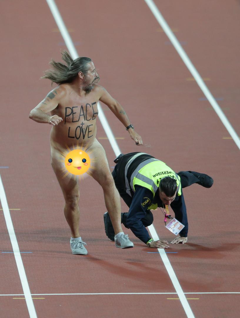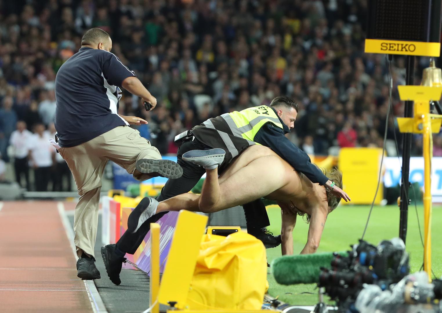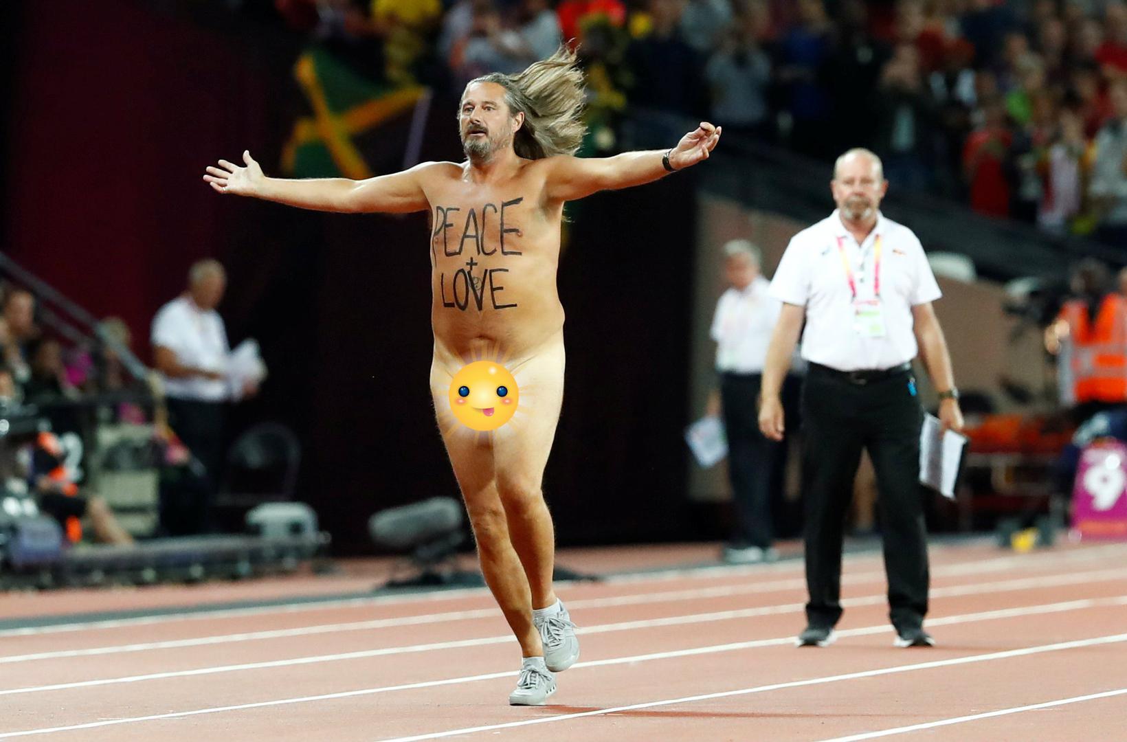Golišava munja najavila oproštajnu utrku Usaina Bolta na 100 metara. 'Streaker' je ušao na stazu i pretrčao 50-ak metara dok ga zaštitari nisu oborili i odveli s borilišta. Londonska publika pozdravila ga pljeskom. Na prsima je imao napisano 'Mir i ljubav', a na leđima 'Za mamu', uz dodatak da nije drogiran.