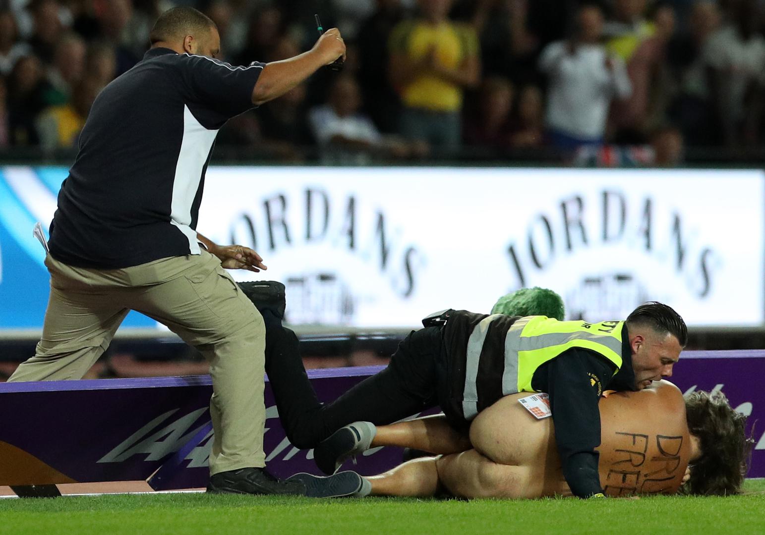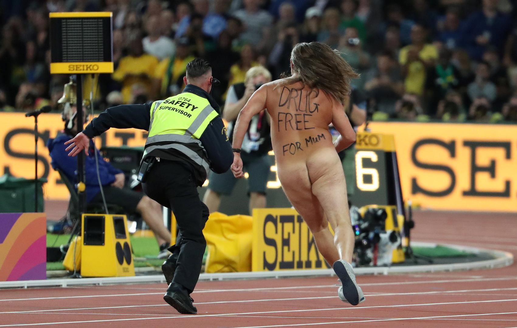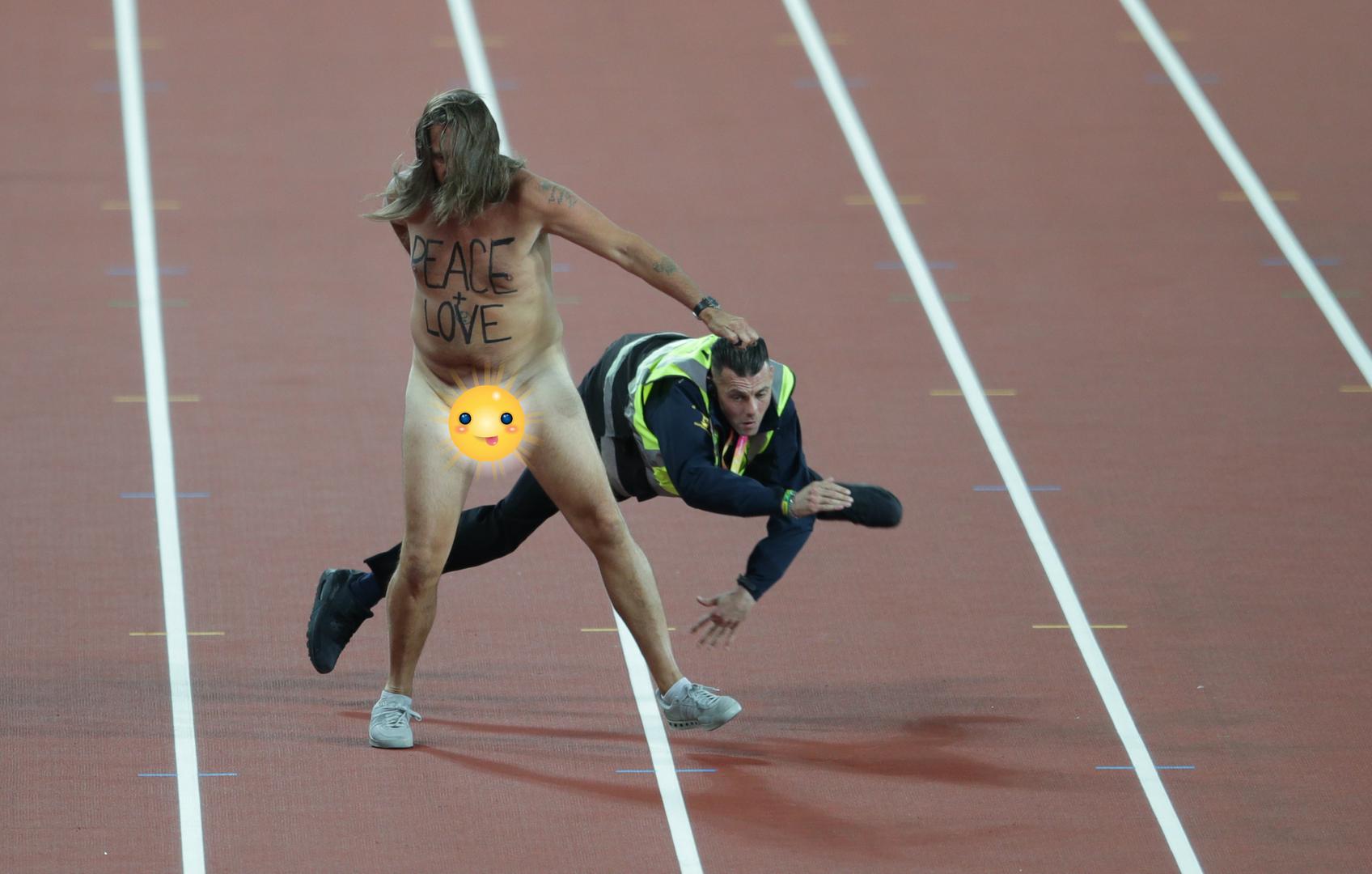 Golišava munja najavila oproštajnu utrku Usaina Bolta na 100 metara. 'Streaker' je ušao na stazu i pretrčao 50-ak metara dok ga zaštitari nisu oborili i odveli s borilišta. Londonska publika pozdravila ga pljeskom. Na prsima je imao napisano 'Mir i ljubav', a na leđima 'Za mamu', uz dodatak da nije drogiran.