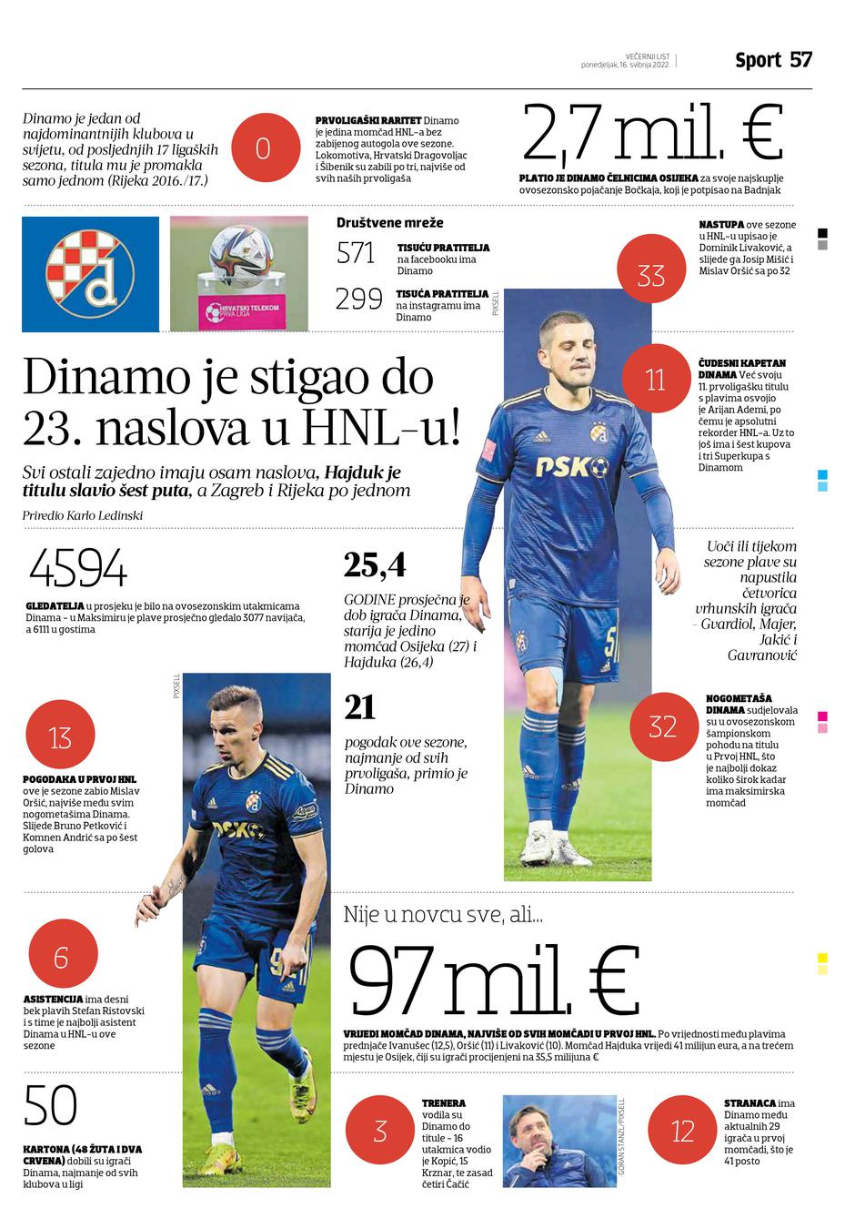 • 97 milijuna eura vrijedi momčad Dinama, najviše od svih momčadi u Prvoj HNL. Po vrijednosti prednjače Ivanušec (12,5), Oršić (11) i Livaković (10)