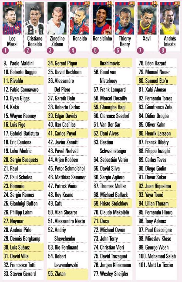 Kojim su se kriterijem vodili urednici lista, doista ne znamo, ali zanimljivo je primijetiti da su prvih osam pozicija zauzeli sadašnji ili bivši igrači Barcelone i Reala.
