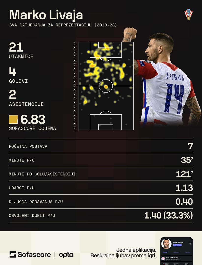 Krenimo od onoga što je Livaja do sada proizveo u nacionalnom dresu. Dakle, Marko Livaja za Hrvatsku od rujna 2018. do ožujka 2023. godine ima 21 nastup, postigao je četiri pogotka – protiv Slovenije, Cipra, Austrije i Kanade – te ima dvije asistencije. Marko je kod Dalića u prosjeku igrao 34 i pol minute po utakmici, bio je sudionik Svjetskog prvenstva u Kataru, a posljednju utakmicu za Hrvatsku odigrao je u Splitu 25. ožujka 2023. godine protiv Walesa (1:1) u kvalifikacijama za Europsko prvenstvo.