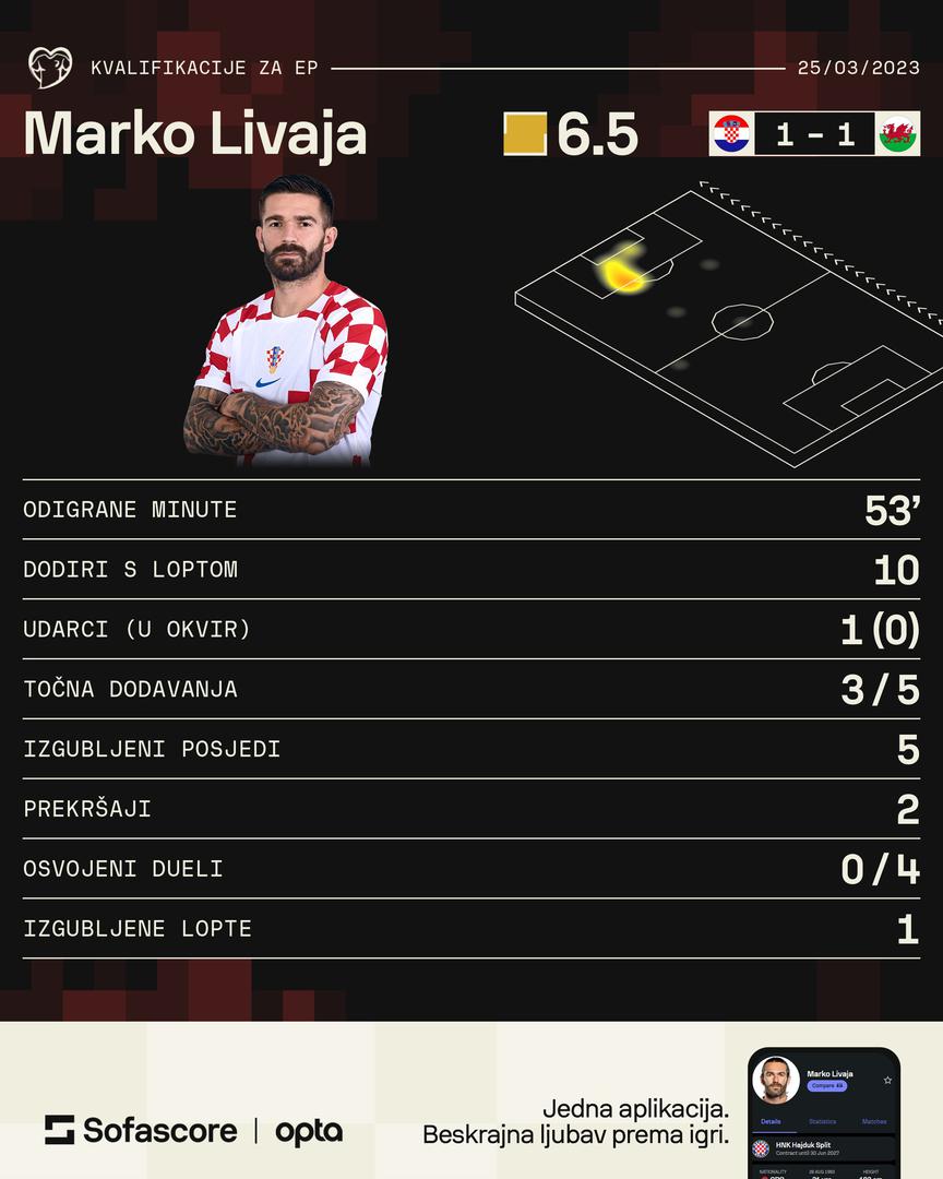 Zadržimo se malo na toj utakmici. Livaja je u njoj istrčao od prve minute s brojem 20 na leđima, ali i s "20 tona" tereta na leđima, budući da je Dalić u njoj na raspolaganju imao samo još jednog centralnog napadača, Petra Musu. Nije bilo ni Petkovića, ni Budimira. Marko Livaja, u tom trenutku već opjevana zvijezda i dominantna figura HNL-a, u utakmici s Walesom bio je po općem dojmu jedan od najslabijih igrača na terenu. Igrao je do 53. minute, kada ga je zamijenio Musa, na Sofascoreu imao je ocjenu 6.5, manje od njega imali su samo Livaković (6.3) i Velšanin Ampadu (6.4). Marko Livaja u toj je utakmici, pred prepunim Poljudom, imao samo deset dodira s loptom, jedan šut izvan okvira, niti jedan u okvir, niti jedan pokušaj driblinga, imao je 60-postotnu točnost u dodavanjima (3/5). Naravno, nije Livaja te splitske večeri sam igrao protiv Velšana, napadač živi od raspoloženja suigrača i o njima ovisi, pa onda i sve ove brojke treba uzeti s dozom rezerve i za njih podijeliti odgovornost i na ostatak momčadi.