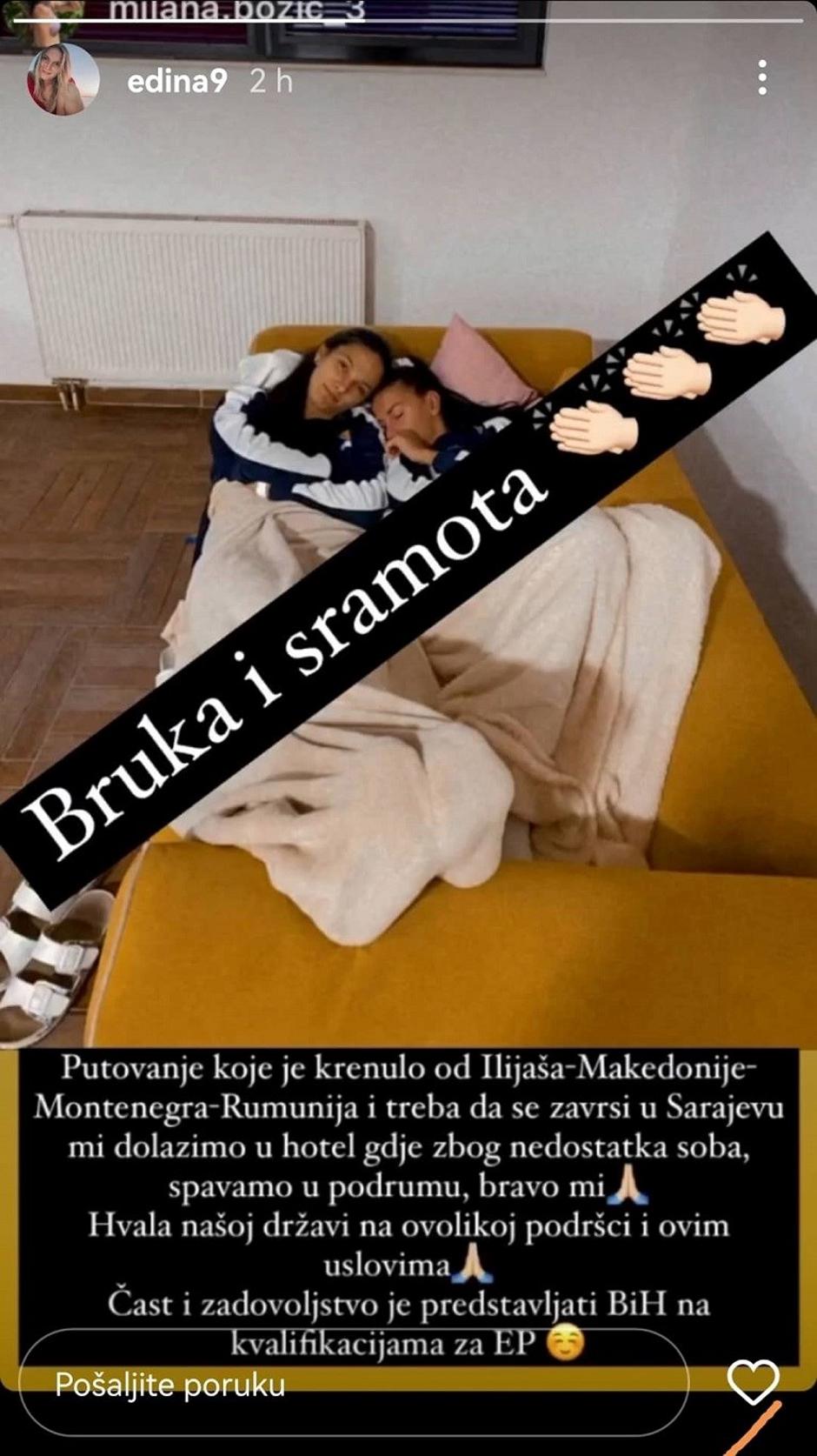 Hvala našoj državi na ovolikoj podršci i ovim uvjetima. Čast i zadovoljstvo je predstavljati BiH na kvalifikacijama za EP", napisala je na Instagramu reprezentativka BiH Milana Božić uz fotografiju kako stisnuta uz suigračicu leži na kauču. Njen story podijelila je i suigračica Edina Begić uz natpis "Bruka i sramota".