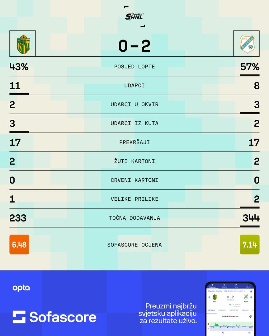 Rijeka vodi na ljestvici sa 68 bodova, Dinamo ima 63 ali i susret manje, a Hajduk je treći sa 55 bodova. Osijek je ponovo četvrti sa 45 bodova, a peta Lokomotiva ima bod manje. Istra je deveta sa 28 bodova, dok je zadnji Rudeš sa sedam bodova.