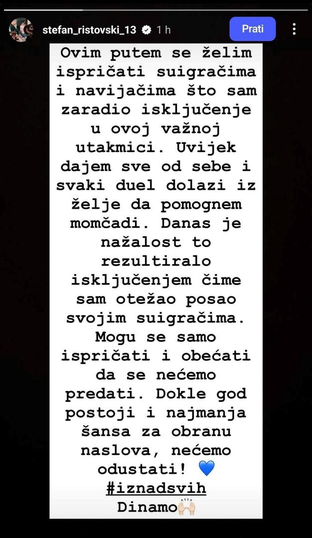 Putem Instagrama se nakon utakmice javio Ristovski. "Ovim putem se želim ispričati suigračima i navijačima što sam zaradio isključenje u ovako važnoj utakmici. Uvijek dajem sve od sebe i svaki duel dolazi iz želje da pomognem momčadi. Danas je, nažalost, to rezultiralo isključenjem, čime sam otežao posao svojim suigračima. Mogu se samo ispričati i obećati da se nećemo predati. Dokle god postoji i najmanja šansa za obranu naslova, nećemo odustati", napisao je Ristovski na Instagramu.