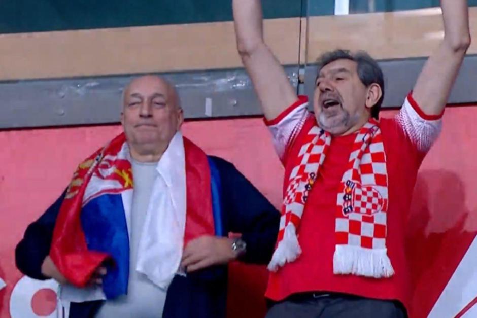 Zanimljiva scena na tribinama beogradske arene viđena je krajem prve četvrtine utakmice između Hrvatske i Italije koja je završila 3:3. Televizijska kamera uhvatila je dvojicu navijača, od kojih je jedan bio zagrnut srpskom zastavom, a drugi hrvatskim šalom, i veselio se golu naše reprezentacije.