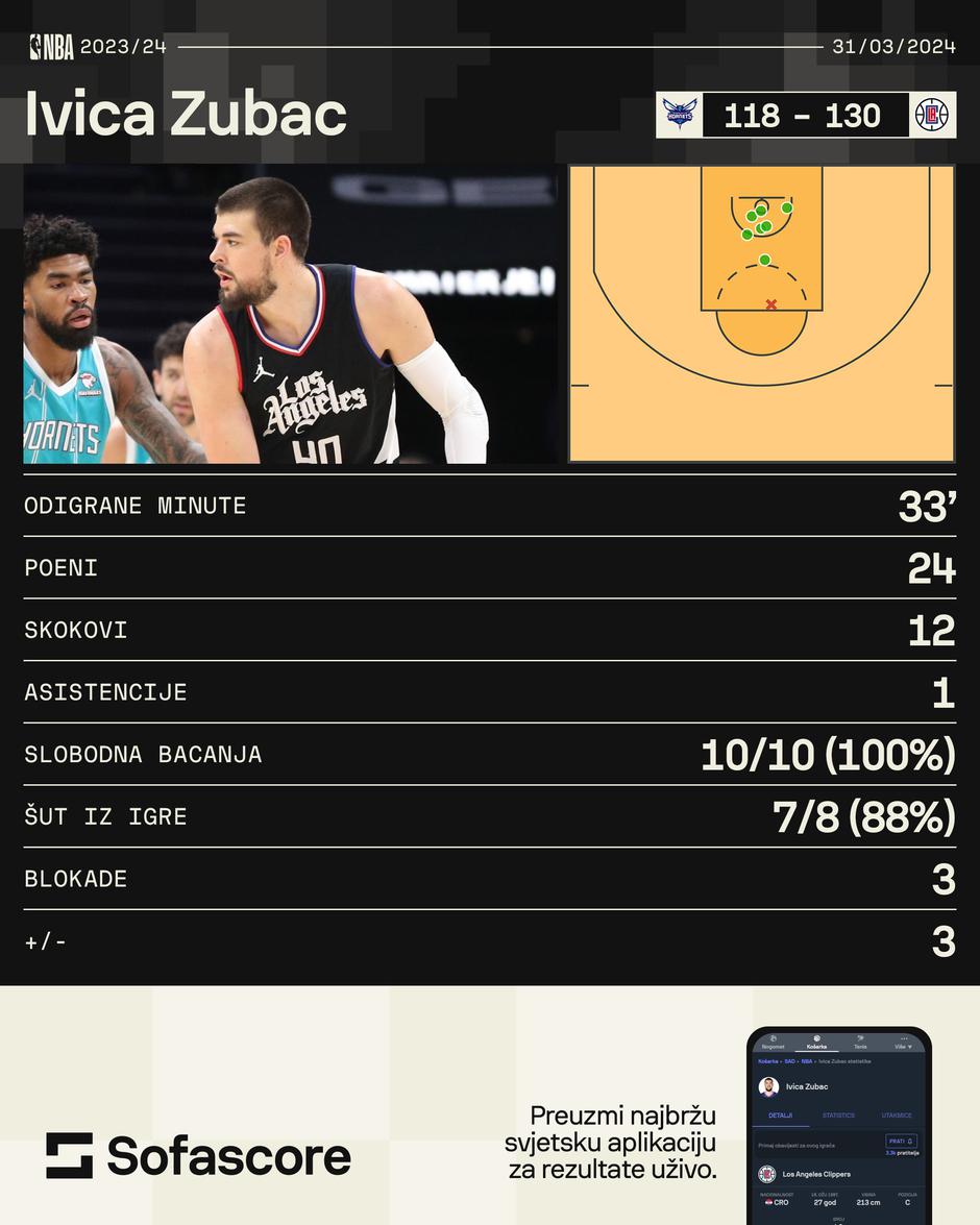 Los Angeles Clippersi Ivice Zubca su sinoć na gostovanju s 130-118 slavili protiv Charlotte Hornetsa, a hrvatski je košarkaš u pobjedi svoje momčadi sudjelovao s double-double učinkom. Zubac je na terenu proveo 33:08 minuta i upisao double-double učinak zabivši 24 koša uz samo jedan promašaj iz igre i ugrabivši 12 skokova uz jednu asistenciju i tri blokade. Paul George je bio najbolji strijelac utakmice i pobjedničke momčadi s 41 poenom od čega je osam trica. Kawhi Leonard je ubacio 23 poena.