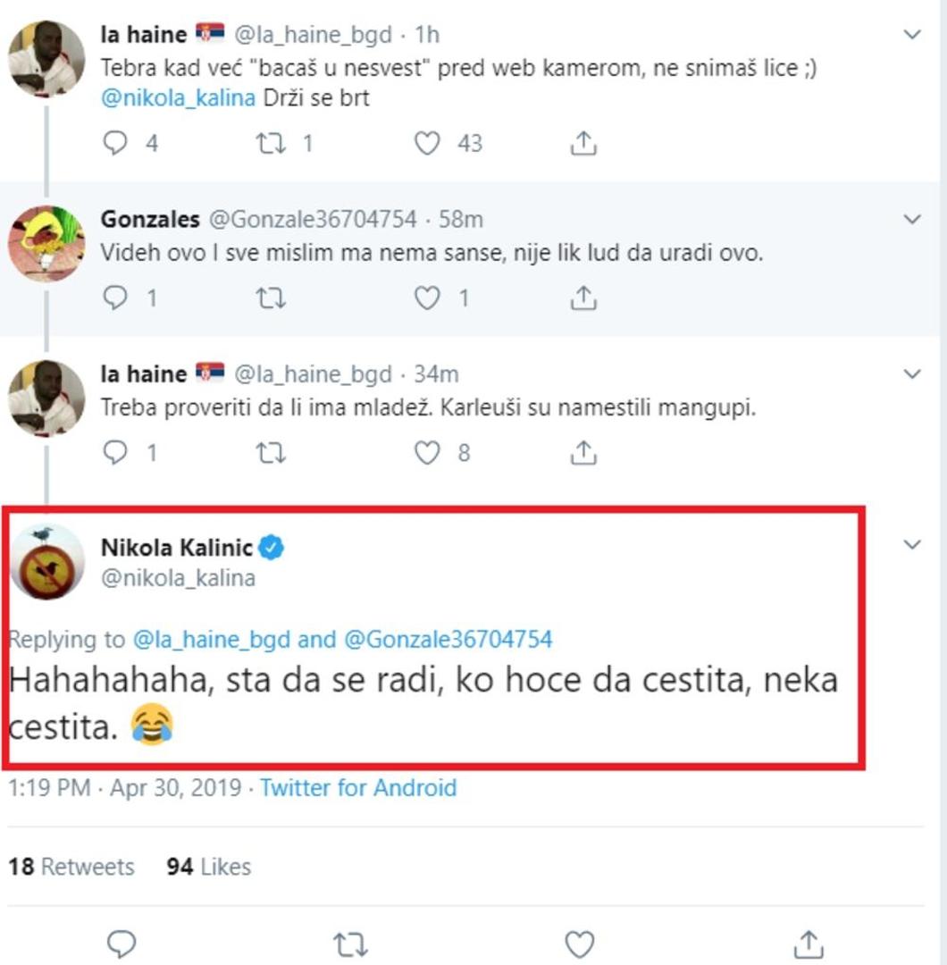 Da se snimao bivšoj djevojci rekao je i Kalinić, ali on je po izbijanju skandala sve primio s dozom humora te je čak odgovorio i pratiteljima na Twitteru koji su mu ostavljali komentare.