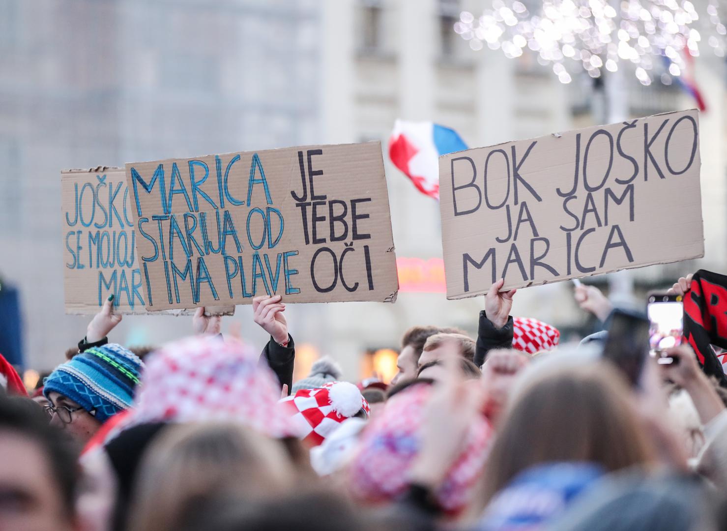 ''Bok Joško ja sam Marica. Marica je starija od tebe i ima plave oči'', glasi jedan transparent na Trgu Bana Jelačića. Druga dama pak je napisala: ''Joško kad se misliš javiti?'', uz QR kod. Na putu prema glavnom zagrebačkom trgu fotografi su snimili i dječaka s maskom poput Joška Gvardiola uz natpis: ''Joško majstore, može majica?''.