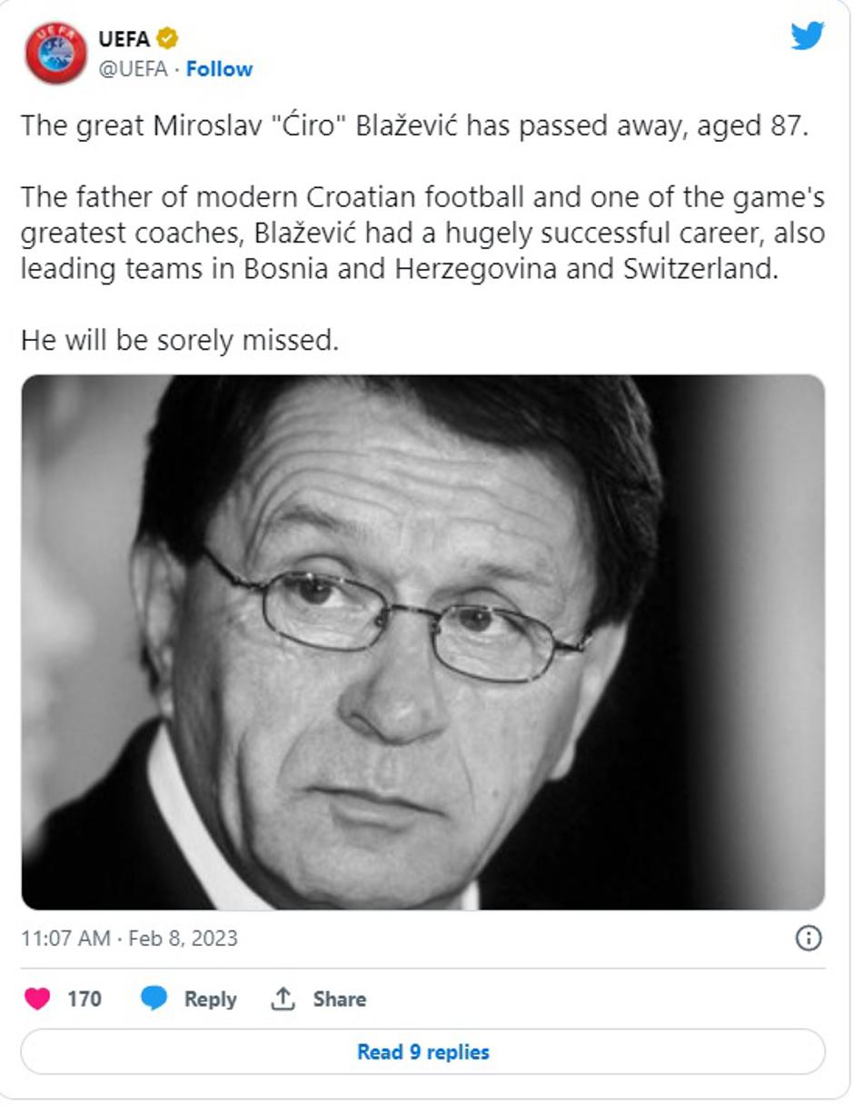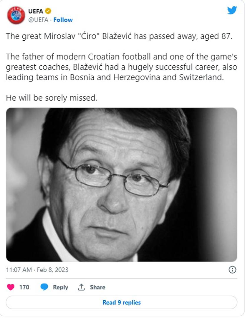 "Preminuo je veliki Miroslav Ćiro Blažević. Bilo mu je 87. Otac modernog nogometa u Hrvatskoj i jedan od najboljih hrvatskih trenera imao je uspješnu karijeru, a među ostalima vodio je klubove u Bosni i Hercegovini i Švicarskoj. Jako će nedostajati", objavila je UEFA.
